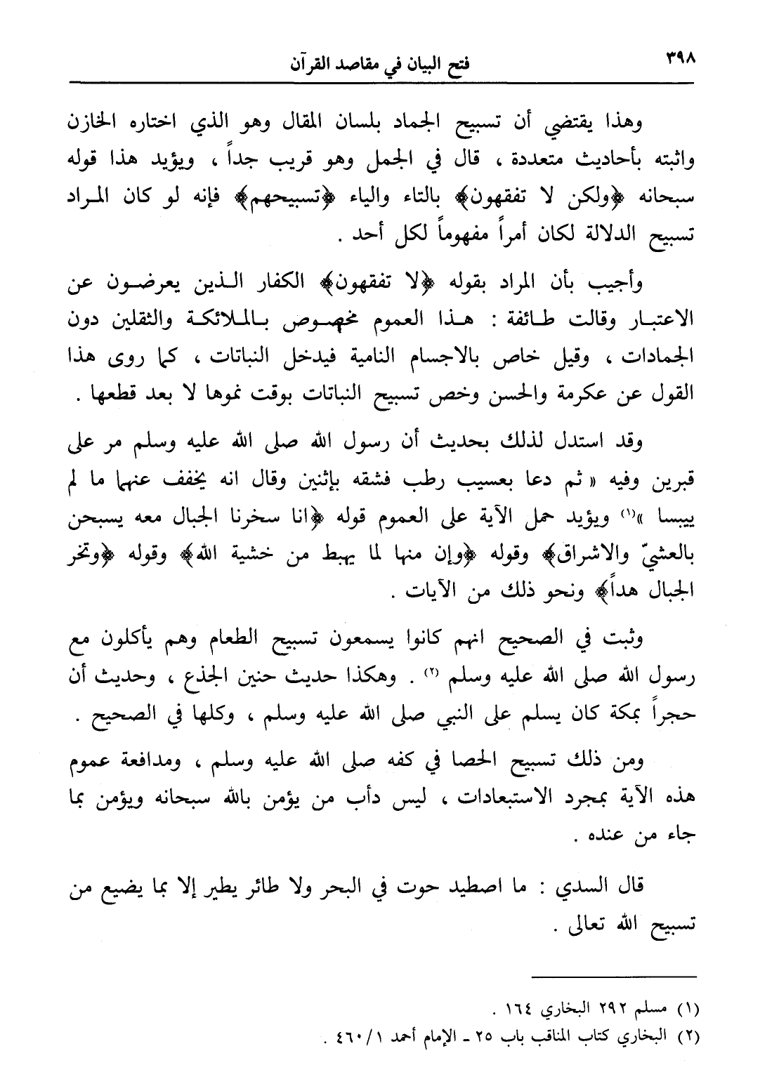 وهذا يقتضي أن تسبيح الجماد بلسان المقال وهو الذي اختاره الخازن وأثبته بأحاديث متعددة، قال في الجمل وهو قريب جداً، ويؤيد هذا قوله سبحانه (ولكن لا تفقهون) بالتاء والياء (تسبيحهم) فإنه لو كان المراد تسبيح الدلالة لكان أمراً مفهوماً لكل أحد.