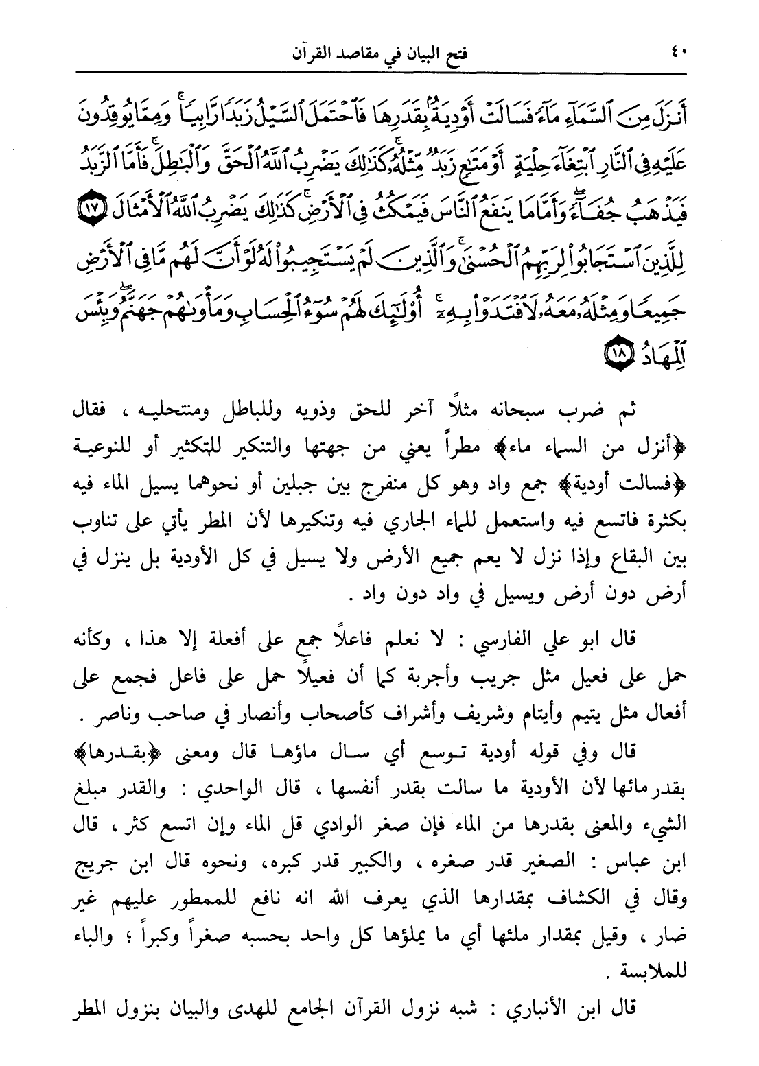 (أنزل من السماء ماء) مطراً يعني من جهتها والتنكير للتكثير أو للنوعية (فسالت أودية) جمع واد وهو كل منفرج بين جبلين أو نحوهما يسيل الماء فيه بكثرة فاتسع فيه واستعمل للماء الجاري فيه وتنكيرها لأن المطر يأتي على تناوب بين البقاع وإذا نزل لا يعم جميع الأرض ولا يسيل في كل الأودية بل ينزل في أرض دون أرض ويسيل في واد دون واد.