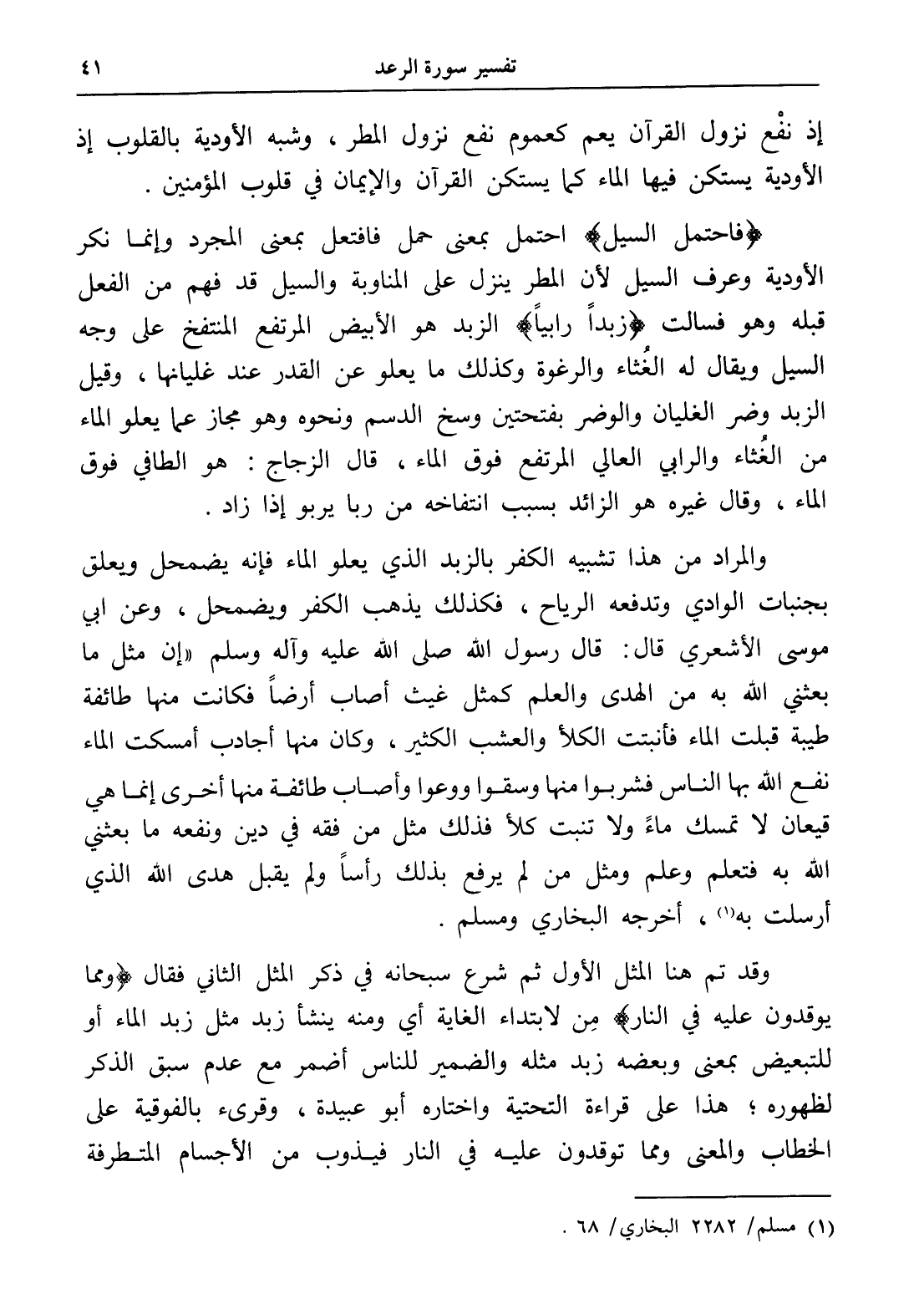 والمراد من هذا تشبيه الكفر بالزبد الذي يعلو الماء فإنه يضمحل ويعلق بجنبات الوادي وتدفعه الرياح، فكذلك يذهب الكفر ويضمحل، وعن أبي موسى الأشعري قال: قال رسول الله صلى الله عليه وآله وسلم " إن مثل ما بعثني الله به من الهدى والعلم كمثل غيث أصاب أرضاً فكانت منها طائفة طيبة قبلت الماء فأنبتت الكلأ والعشب الكثير، وكان منها أجادب أمسكت الماء نفع الله بها الناس فشربوا منها وسقوا ووعوا وأصاب طائفة منها أخرى إنما هي قيعان لا تمسك ماءً ولا تنبت كلأ فذلك مثل من فقه في دين ونفعه ما بعثني الله به فتعلم وعلم ومثل من لم يرفع بذلك رأساً ولم يقبل هدى الله الذي أرسلت به (¬1)، أخرجه البخاري ومسلم.