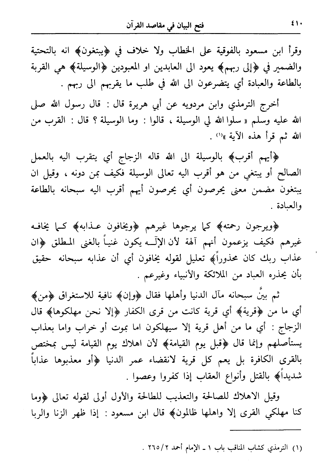 أخرج الترمذي وابن مردويه عن أبي هريرة قال: قال رسول الله صلى الله عليه وسلم " سلوا الله لي الوسيلة "، قالوا: وما الوسيلة؟ قال: " القرب من الله ثم قرأ هذه الآية " (¬1).