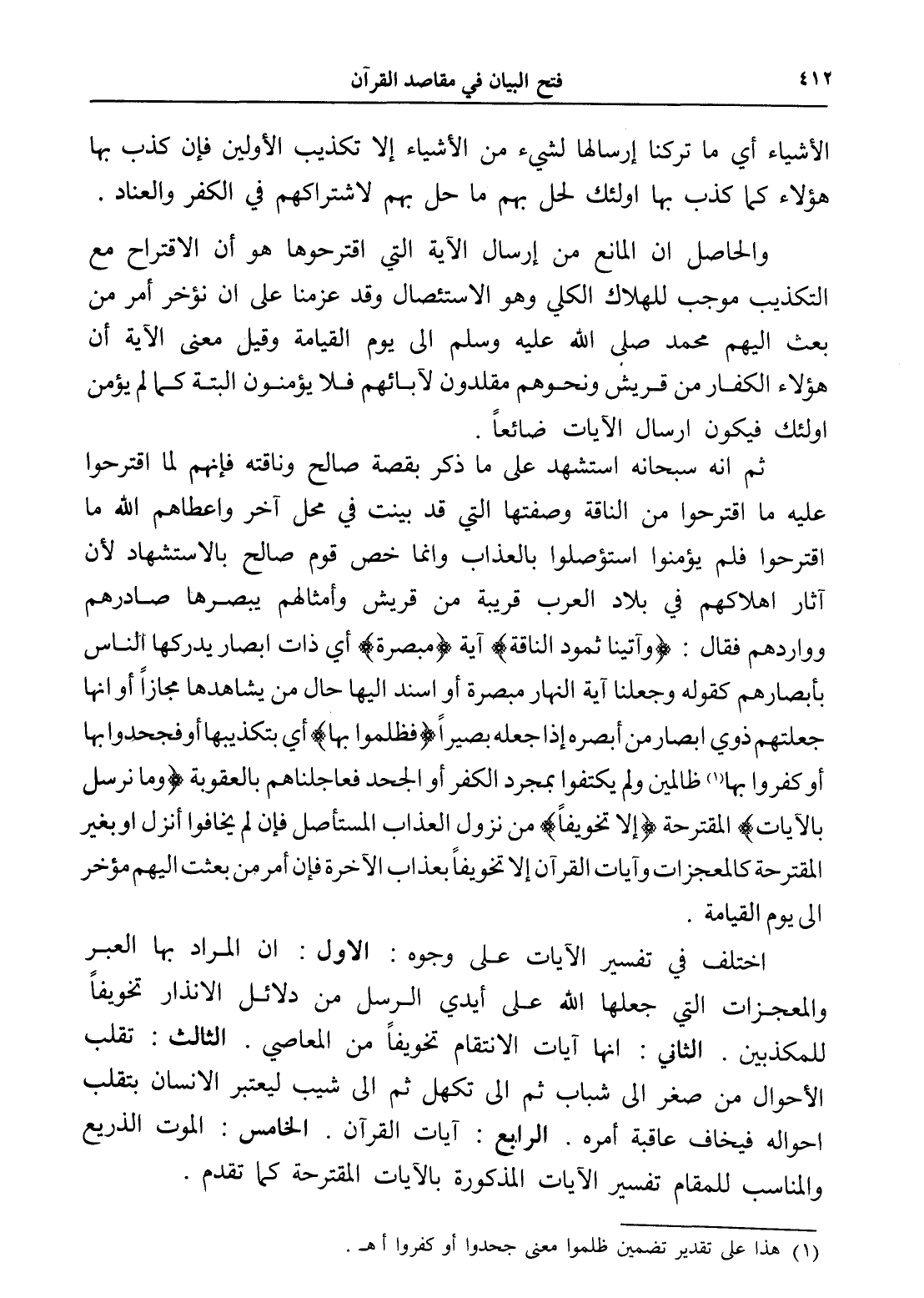 ثم أنه سبحانه استشهد على ما ذكر بقصة صالح وناقته فإنهم لما اقترحوا عليه ما اقترحوا من الناقة وصفتها التي قد بينت في محل آخر وأعطاهم الله ما أقترحوا فلم يؤمنوا استؤصلوا بالعذاب وإنما خص قوم صالح بالاستشهاد لأن آثار إهلاكهم في بلاد العرب قريبة من قريش وأمثالهم يبصرها صادرهم وواردهم فقال: (وآتينا ثمود الناقة) آية (مبصرة) أي ذات إبصار يدركها الناس بأبصارهم كقوله وجعلنا آية النهار مبصرة أو أسند إليها حال من يشاهدها مجازاً أو أنها جعلتهم ذوي إبصار من أبصره إذا جعله بصيراً (فظلموا بها) أي بتكذيبها أو فجحدوا بها أو كفروا بها (¬1) ظالمين ولم يكتفوا بمجرد الكفر أو الجحد فعاجلناهم بالعقوبة (وما نرسل بالآيات) المقترحة (إلا تخويفاً) من نزول العذاب المستأصل فإن لم يخافوا أنزل أو بغير المقترحة كالمعجزات وآيات القرآن إلا تخويفاً بعذاب الآخرة فإن أمر من بعثت إليهم مؤخر إلى يوم القيامة.