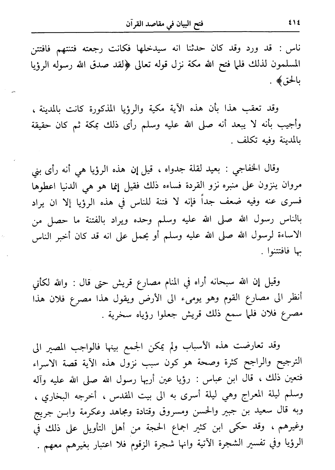وقال الخفاجي: بعيد لقلة جدواه، قيل أن هذه الرؤيا هي أنه رأى بني مروان ينزون على منبره نزو القردة فساءه ذلك فقيل إنما هو هي الدنيا أعطوها فسرى عنه وفيه ضعف جداً فإنه لا فتنة للناس في هذه الرؤيا إلا أن يراد بالناس رسول الله صلى الله عليه وسلم وحده ويراد بالفتنة ما حصل من الإساءة لرسول الله صلى الله عليه وسلم أو يحمل على أنه قد كان أخبر الناس بها فافتتنوا.