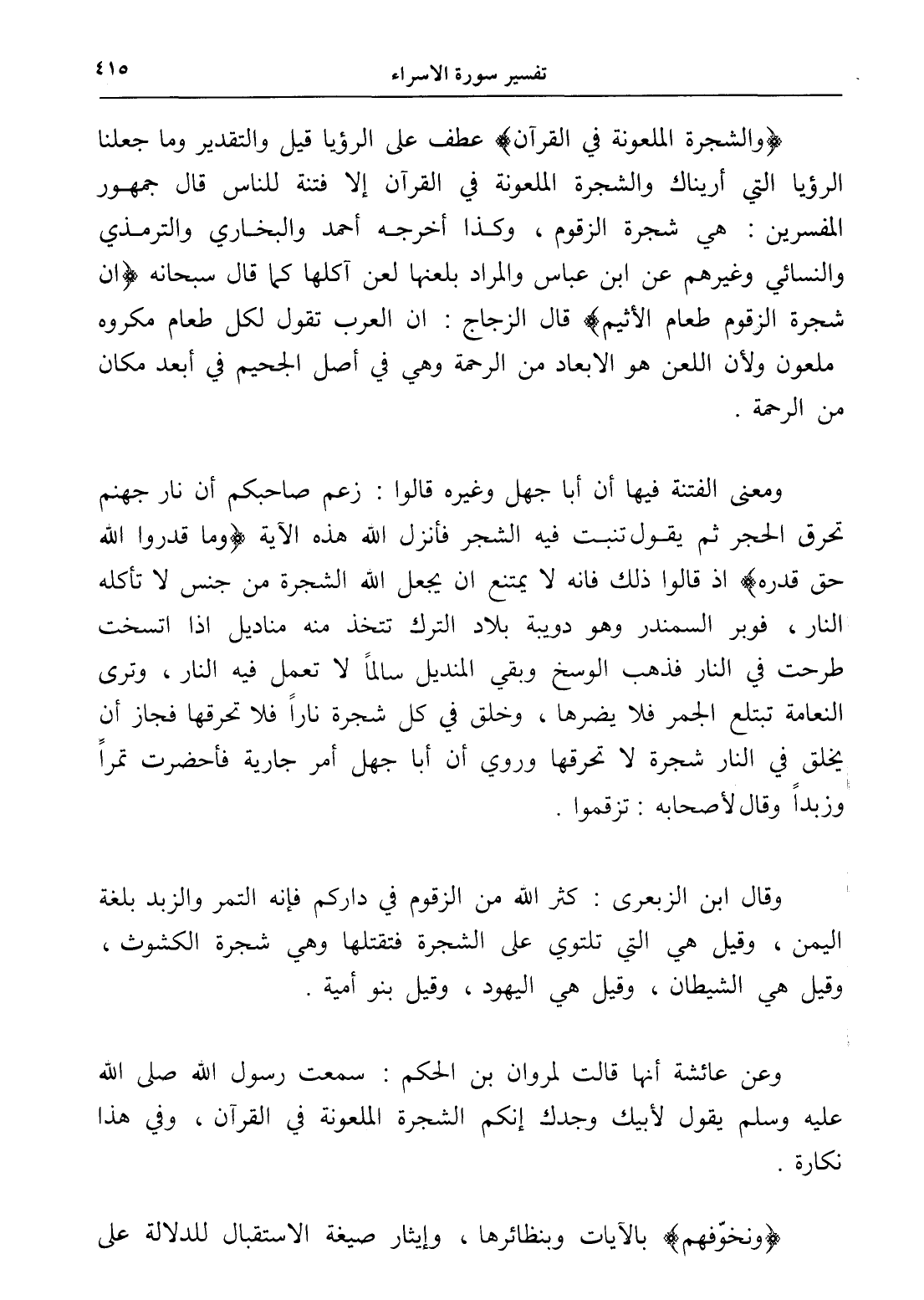 (والشجرة الملعونة في القرآن) عطف على الرؤيا قيل والتقدير وما جعلنا الرؤيا التي أريناك والشجرة الملعونة في القرآن إلا فتنة للناس قال جمهور المفسرين: هي شجرة الزقوم، وكذا أخرجه أحمد والبخاري والترمذي والنسائي وغيرهم عن ابن عباس والمراد بلعنها لعن آكلها كما قال سبحانه (إن شجرة الزقوم طعام الأثيم) قال الزجاج: أن العرب تقول لكل طعام مكروه ملعون ولأن اللعن هو الإبعاد من الرحمة وهي في أصل الجحيم في أبعد مكان من الرحمة.