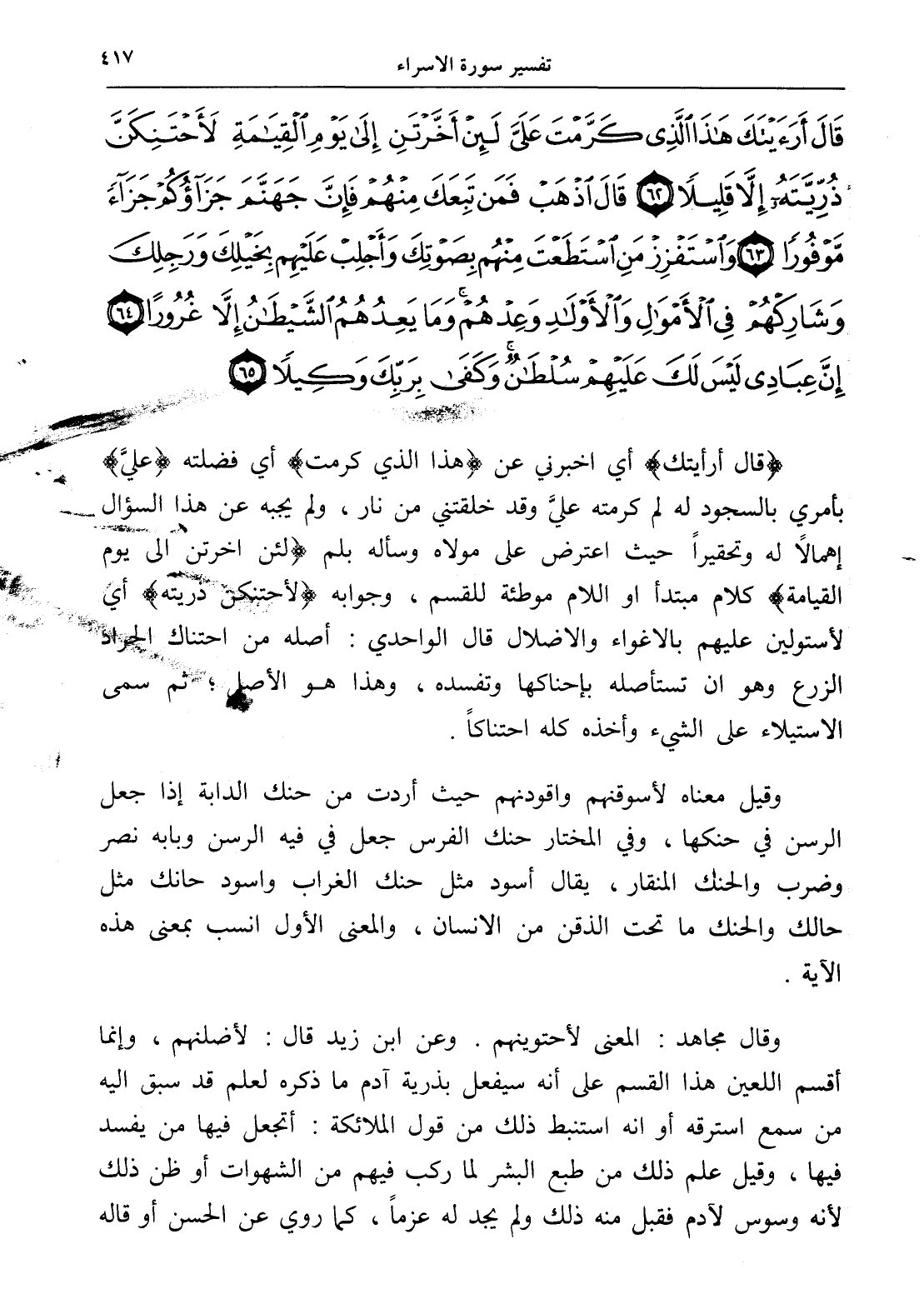 قَالَ أَرَأَيْتَكَ هَذَا الَّذِي كَرَّمْتَ عَلَيَّ لَئِنْ أَخَّرْتَنِ إِلَى يَوْمِ الْقِيَامَةِ لَأَحْتَنِكَنَّ ذُرِّيَّتَهُ إِلَّا قَلِيلًا (62) قَالَ اذْهَبْ فَمَنْ تَبِعَكَ مِنْهُمْ فَإِنَّ جَهَنَّمَ جَزَاؤُكُمْ جَزَاءً مَوْفُورًا (63) وَاسْتَفْزِزْ مَنِ اسْتَطَعْتَ مِنْهُمْ بِصَوْتِكَ وَأَجْلِبْ عَلَيْهِمْ بِخَيْلِكَ وَرَجِلِكَ وَشَارِكْهُمْ فِي الْأَمْوَالِ وَالْأَوْلَادِ وَعِدْهُمْ وَمَا يَعِدُهُمُ الشَّيْطَانُ إِلَّا غُرُورًا (64) إِنَّ عِبَادِي لَيْسَ لَكَ عَلَيْهِمْ سُلْطَانٌ وَكَفَى بِرَبِّكَ وَكِيلًا (65)