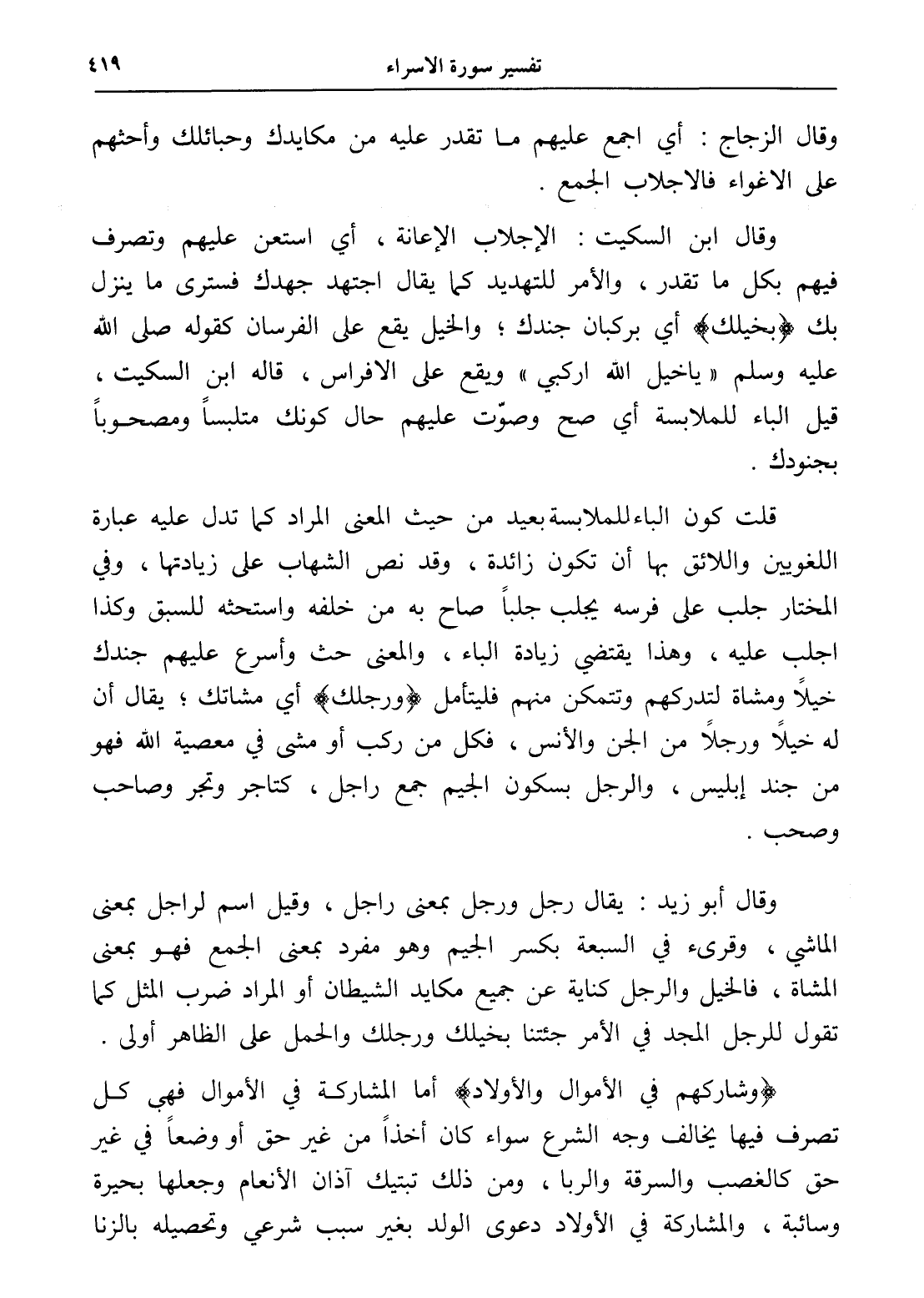 وقال أبو زيد: يقال رجل ورجل بمعنى راجل، وقيل اسم لراجل بمعنى الماشي، وقرئ في السبعة بكسر الجيم وهو مفرد بمعنى الجمع فهو بمعنى المشاة، فالخيل والرجل كناية عن جميع مكايد الشيطان أو المراد ضرب المثل كما تقول للرجل المجد في الأمر جئتنا بخيلك ورجلك والحمل على الظاهر أولى.