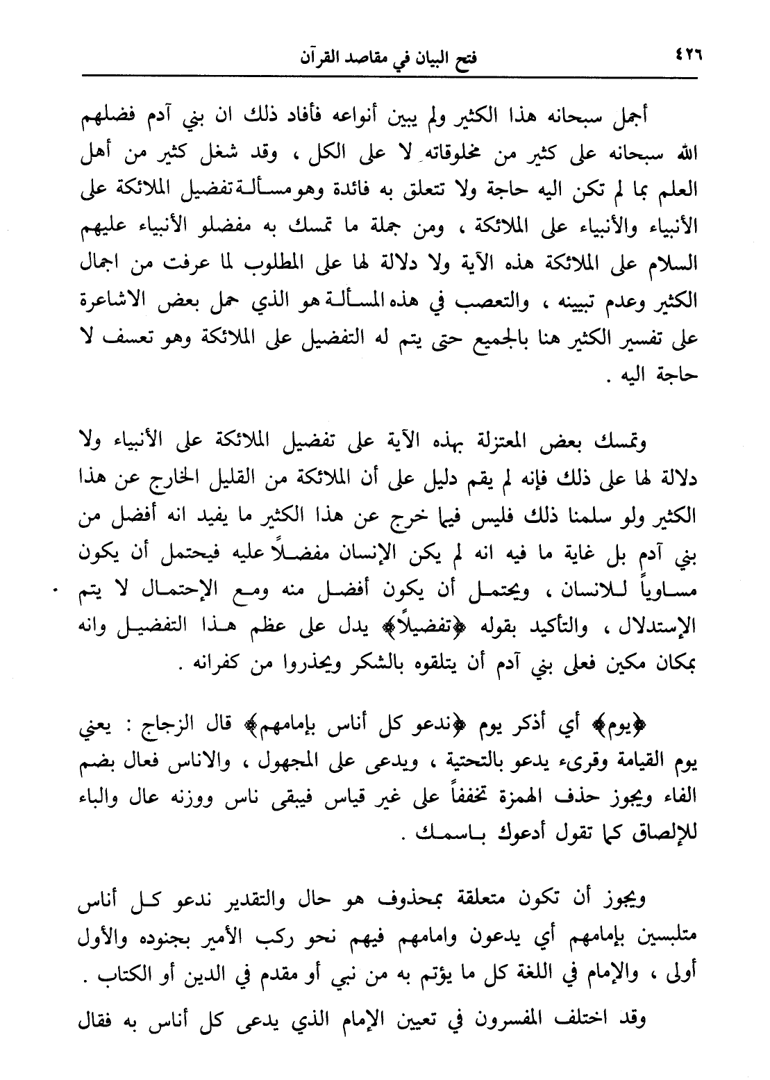 أجمل سبحانه هذا الكثير ولم يبين أنواعه فأفاد ذلك إن بني آدم فضلهم الله سبحانه على كثير من مخلوقاته لا على الكل، وقد شغل كثير من أهل العلم بما لم تكن إليه حاجة ولا تتعلق به فائدة وهو مسألة تفضيل الملائكة على الأنبياء والأنبياء على الملائكة، ومن جملة ما تمسك به مفضلو الأنبياء عليهم السلام على الملائكة هذه الآية ولا دلالة لها على المطلوب لما عرفت من إجمال الكثير وعدم تبيينه، والتعصب في هذه المسألة هو الذي حمل بعض الأشاعرة على تفسير الكثير هنا بالجميع حتى يتم له التفضيل على الملائكة وهو تعسف لا حاجة إليه.