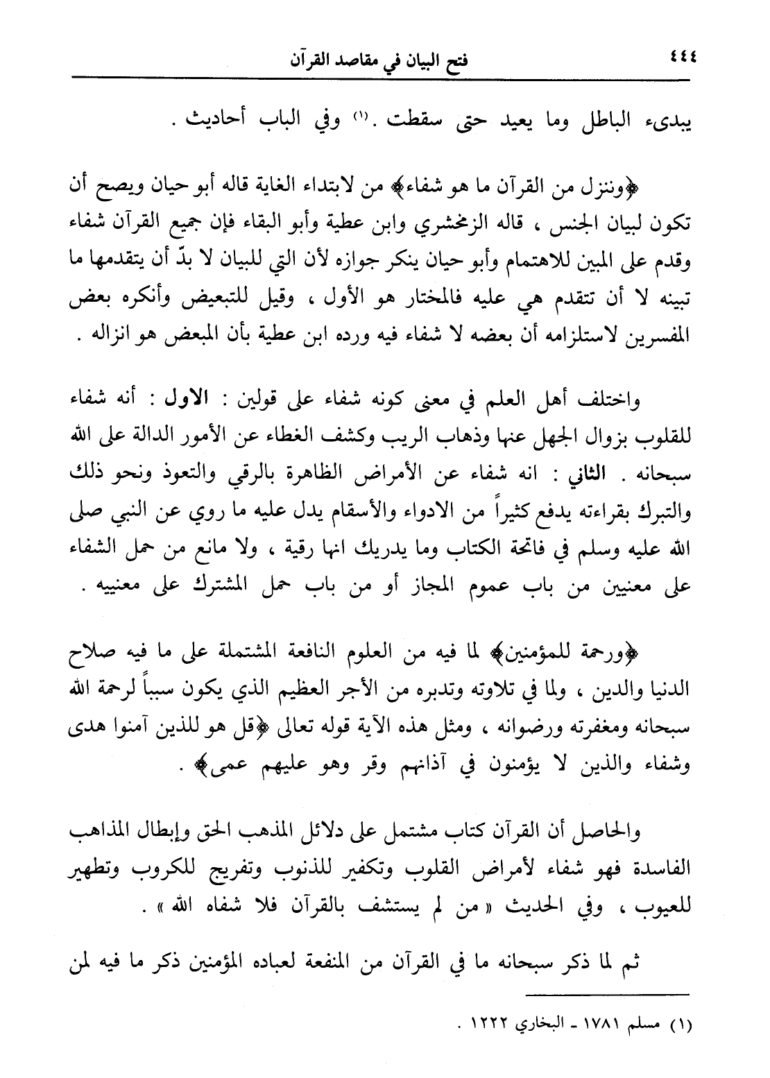 واختلف أهل العلم في معنى كونه شفاء على قولين: الأول: أنه شفاء للقلوب بزوال الجهل عنها وذهاب الريب وكشف الغطاء عن الأمور الدالة على الله سبحانه. الثاني: أنه شفاء عن الأمراض الظاهرة بالرقي والتعوذ ونحو ذلك والتبرك بقراءته يدفع كثيراً من الإدواء والأسقام يدل عليه ما روي عن النبي صلى الله عليه وسلم في فاتحة الكتاب وما يدريك أنها رقية، ولا مانع من حمل الشفاء على معنيين من باب عموم المجاز أو من باب حمل المشترك على معنييه.
