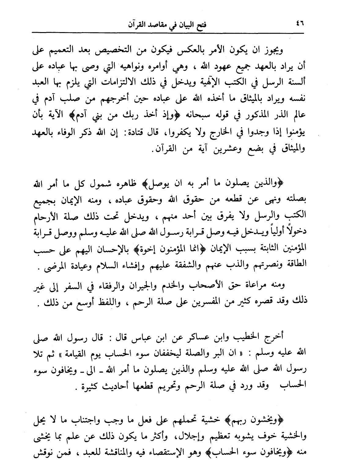(والذين يصلون ما أمر به أن يوصل) ظاهره شمول كل ما أمر الله بصلته ونهى عن قطعه من حقوق الله وحقوق عباده، ومنه الإيمان بجميع الكتب والرسل ولا يفرق بين أحد منهم، ويدخل تحت ذلك صلة الأرحام دخولاً أولياً ويدخل فيه وصل قرابة رسول الله صلى الله عليه وسلم ووصل قرابة المؤمنين الثابتة بسبب الإيمان (إنما المؤمنون إخوة) بالإحسان إليهم على حسب الطاقة ونصرتهم والذب عنهم والشفقة عليهم وإفشاء السلام وعيادة المرضى.