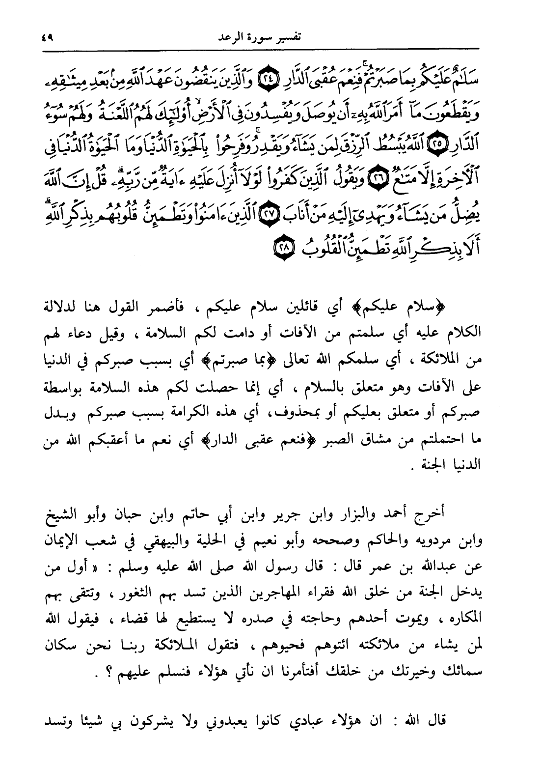 سَلَامٌ عَلَيْكُمْ بِمَا صَبَرْتُمْ فَنِعْمَ عُقْبَى الدَّارِ (24) وَالَّذِينَ يَنْقُضُونَ عَهْدَ اللَّهِ مِنْ بَعْدِ مِيثَاقِهِ وَيَقْطَعُونَ مَا أَمَرَ اللَّهُ بِهِ أَنْ يُوصَلَ وَيُفْسِدُونَ فِي الْأَرْضِ أُولَئِكَ لَهُمُ اللَّعْنَةُ وَلَهُمْ سُوءُ الدَّارِ (25) اللَّهُ يَبْسُطُ الرِّزْقَ لِمَنْ يَشَاءُ وَيَقْدِرُ وَفَرِحُوا بِالْحَيَاةِ الدُّنْيَا وَمَا الْحَيَاةُ الدُّنْيَا فِي الْآخِرَةِ إِلَّا مَتَاعٌ (26) وَيَقُولُ الَّذِينَ كَفَرُوا لَوْلَا أُنْزِلَ عَلَيْهِ آيَةٌ مِنْ رَبِّهِ قُلْ إِنَّ اللَّهَ يُضِلُّ مَنْ يَشَاءُ وَيَهْدِي إِلَيْهِ مَنْ أَنَابَ (27) الَّذِينَ آمَنُوا وَتَطْمَئِنُّ قُلُوبُهُمْ بِذِكْرِ اللَّهِ أَلَا بِذِكْرِ اللَّهِ تَطْمَئِنُّ الْقُلُوبُ (28)