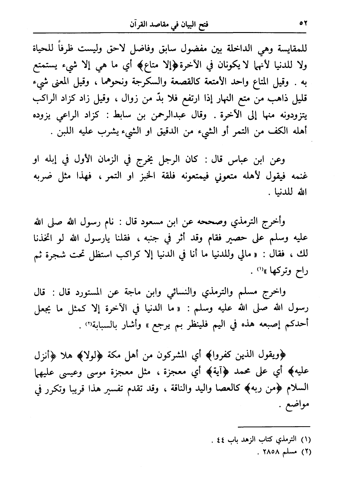 واخرج مسلم والترمذي والنسائي وابن ماجة عن المستورد قال: قال رسول الله صلى الله عليه وسلم: " ما الدنيا في الآخرة إلا كمثل ما يجعل أحدكم إصبعه هذه في اليم فلينظر بم يرجع " وأشار بالسبابة (¬2).