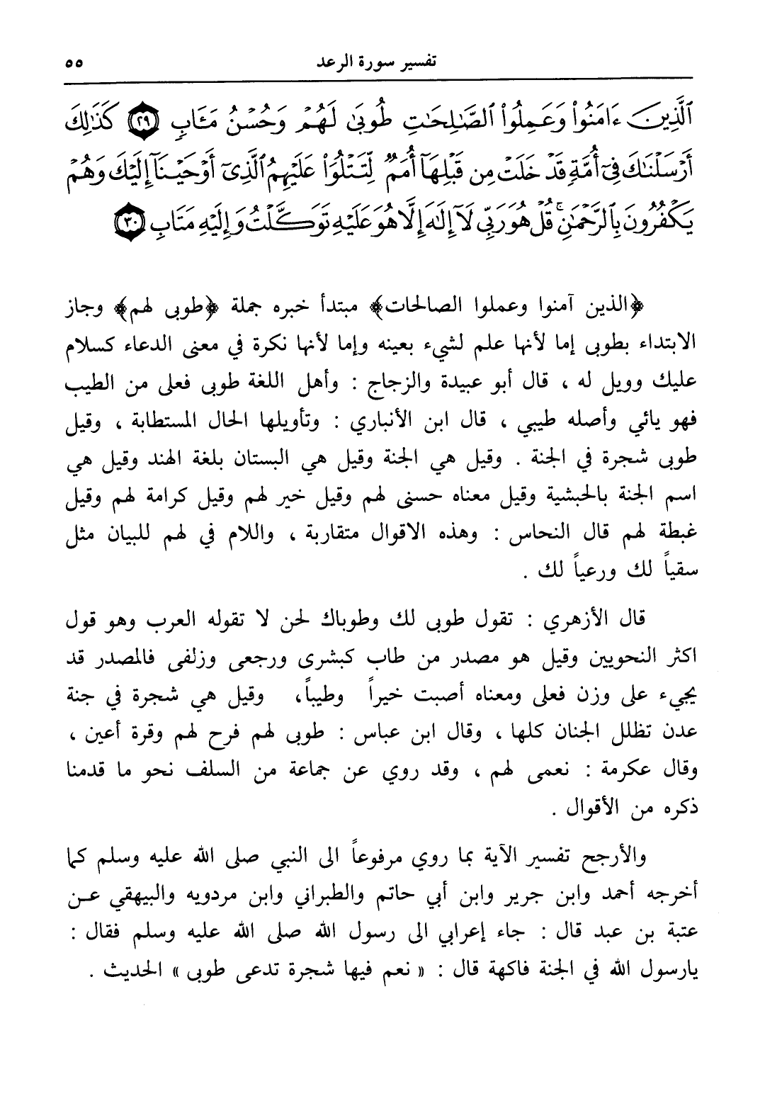 الَّذِينَ آمَنُوا وَعَمِلُوا الصَّالِحَاتِ طُوبَى لَهُمْ وَحُسْنُ مَآبٍ (29) كَذَلِكَ أَرْسَلْنَاكَ فِي أُمَّةٍ قَدْ خَلَتْ مِنْ قَبْلِهَا أُمَمٌ لِتَتْلُوَ عَلَيْهِمُ الَّذِي أَوْحَيْنَا إِلَيْكَ وَهُمْ يَكْفُرُونَ بِالرَّحْمَنِ قُلْ هُوَ رَبِّي لَا إِلَهَ إِلَّا هُوَ عَلَيْهِ تَوَكَّلْتُ وَإِلَيْهِ مَتَابِ (30)