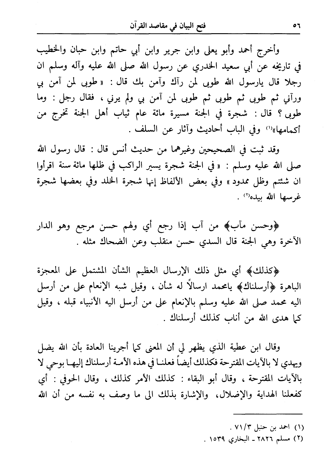 وأخرج أحمد وأبو يعلى وابن جرير وابن أبي حاتم وابن حبان والخطيب في تاريخه عن أبي سعيد الخدري عن رسول الله صلى الله عليه وآله وسلم أن رجلاً قال يا رسول الله طوبى لمن رآك وآمن بك قال: " طوبى لمن آمن بي ورآني ثم طوبى ثم طوبى ثم طوبى لمن آمن بي ولم يرني، فقال رجل: وما طوبى؟ قال: شجرة في الجنة مسيرة مائة عام ثياب أهل الجنة تخرج من أكمامها " (¬1) وفي الباب أحاديث وآثار عن السلف.
