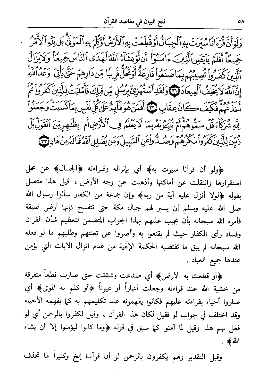 وَلَوْ أَنَّ قُرْآنًا سُيِّرَتْ بِهِ الْجِبَالُ أَوْ قُطِّعَتْ بِهِ الْأَرْضُ أَوْ كُلِّمَ بِهِ الْمَوْتَى بَلْ لِلَّهِ الْأَمْرُ جَمِيعًا أَفَلَمْ يَيْأَسِ الَّذِينَ آمَنُوا أَنْ لَوْ يَشَاءُ اللَّهُ لَهَدَى النَّاسَ جَمِيعًا وَلَا يَزَالُ الَّذِينَ كَفَرُوا تُصِيبُهُمْ بِمَا صَنَعُوا قَارِعَةٌ أَوْ تَحُلُّ قَرِيبًا مِنْ دَارِهِمْ حَتَّى يَأْتِيَ وَعْدُ اللَّهِ إِنَّ اللَّهَ لَا يُخْلِفُ الْمِيعَادَ (31) وَلَقَدِ اسْتُهْزِئَ بِرُسُلٍ مِنْ قَبْلِكَ فَأَمْلَيْتُ لِلَّذِينَ كَفَرُوا ثُمَّ أَخَذْتُهُمْ فَكَيْفَ كَانَ عِقَابِ (32) أَفَمَنْ هُوَ قَائِمٌ عَلَى كُلِّ نَفْسٍ بِمَا كَسَبَتْ وَجَعَلُوا لِلَّهِ شُرَكَاءَ قُلْ سَمُّوهُمْ أَمْ تُنَبِّئُونَهُ بِمَا لَا يَعْلَمُ فِي الْأَرْضِ أَمْ بِظَاهِرٍ مِنَ الْقَوْلِ بَلْ زُيِّنَ لِلَّذِينَ كَفَرُوا مَكْرُهُمْ وَصُدُّوا عَنِ السَّبِيلِ وَمَنْ يُضْلِلِ اللَّهُ فَمَا لَهُ مِنْ هَادٍ (33)