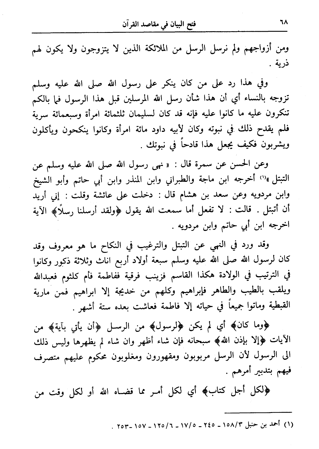 وعن الحسن عن سمرة قال: " نهى رسول الله صلى الله عليه وسلم عن التبتل " (¬1) أخرجه ابن ماجة والطبراني وابن المنذر وابن أبي حاتم وأبو الشيخ وابن مردويه وعن سعد بن هشام قال: دخلت على عائشة وقلت: إني أريد أن أتبتل. قالت: لا تفعل أما سمعت الله يقول (ولقد أرسلنا رسلاً) الآية أخرجه ابن أبي حاتم وابن مردويه.