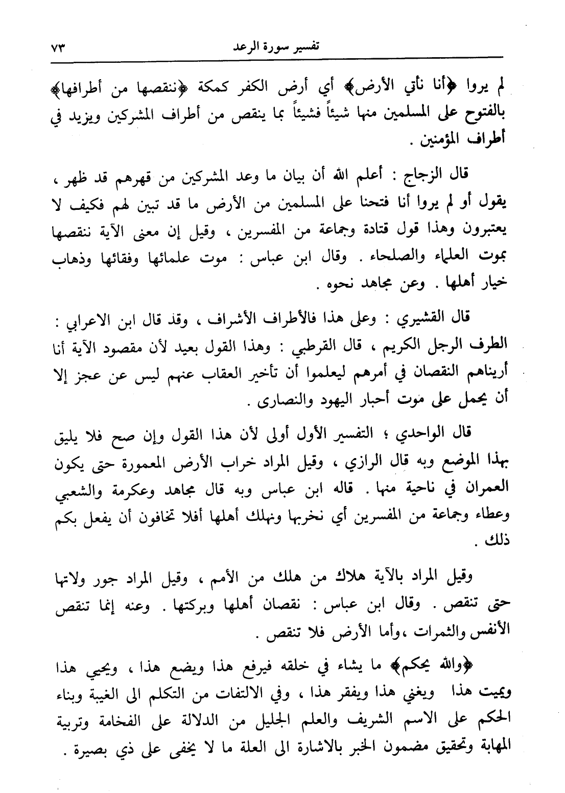 قال الزجاج: أعلم الله أن بيان ما وعد المشركين من قهرهم قد ظهر، يقول أو لم يروا أنا فتحنا على المسلمين من الأرض ما قد تبين لهم فكيف لا يعتبرون وهذا قول قتادة وجماعة من المفسرين، وقيل أن معنى الآية ننقصها بموت العلماء والصلحاء. وقال ابن عباس: موت علمائها وفقائها وذهاب خيار أهلها. وعن مجاهد نحوه.