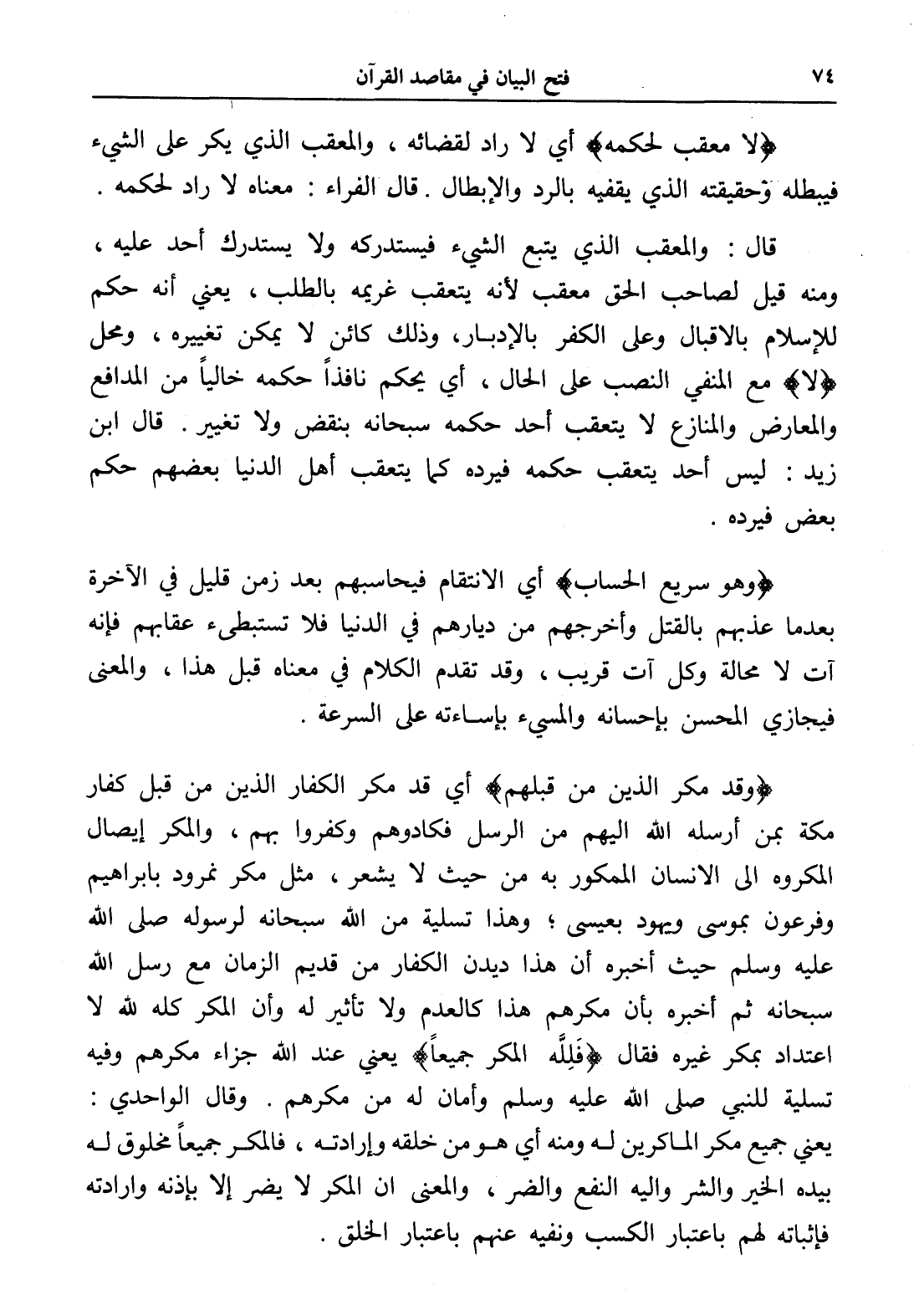 قال: والمعقب الذي يتبع الشيء فيستدركه ولا يستدرك أحد عليه، ومنه قيل لصاحب الحق معقب لأنه يتعقب غريمه بالطلب، يعني أنه حكم للإسلام بالإقبال وعلى الكفر بالإدبار، وذلك كائن لا يمكن تغييره، ومحل (لا) مع المنفي النصب على الحال، أي يحكم نافذاً حكمه خالياً من الدافع والمعارض والمنازع لا يتعقب أحد حكمه سبحانه بنقض ولا تغيير. قال ابن زيد: ليس أحد يتعقب حكمه فيرده كما يتعقب أهل الدنيا بعضهم حكم بعض فيرده.