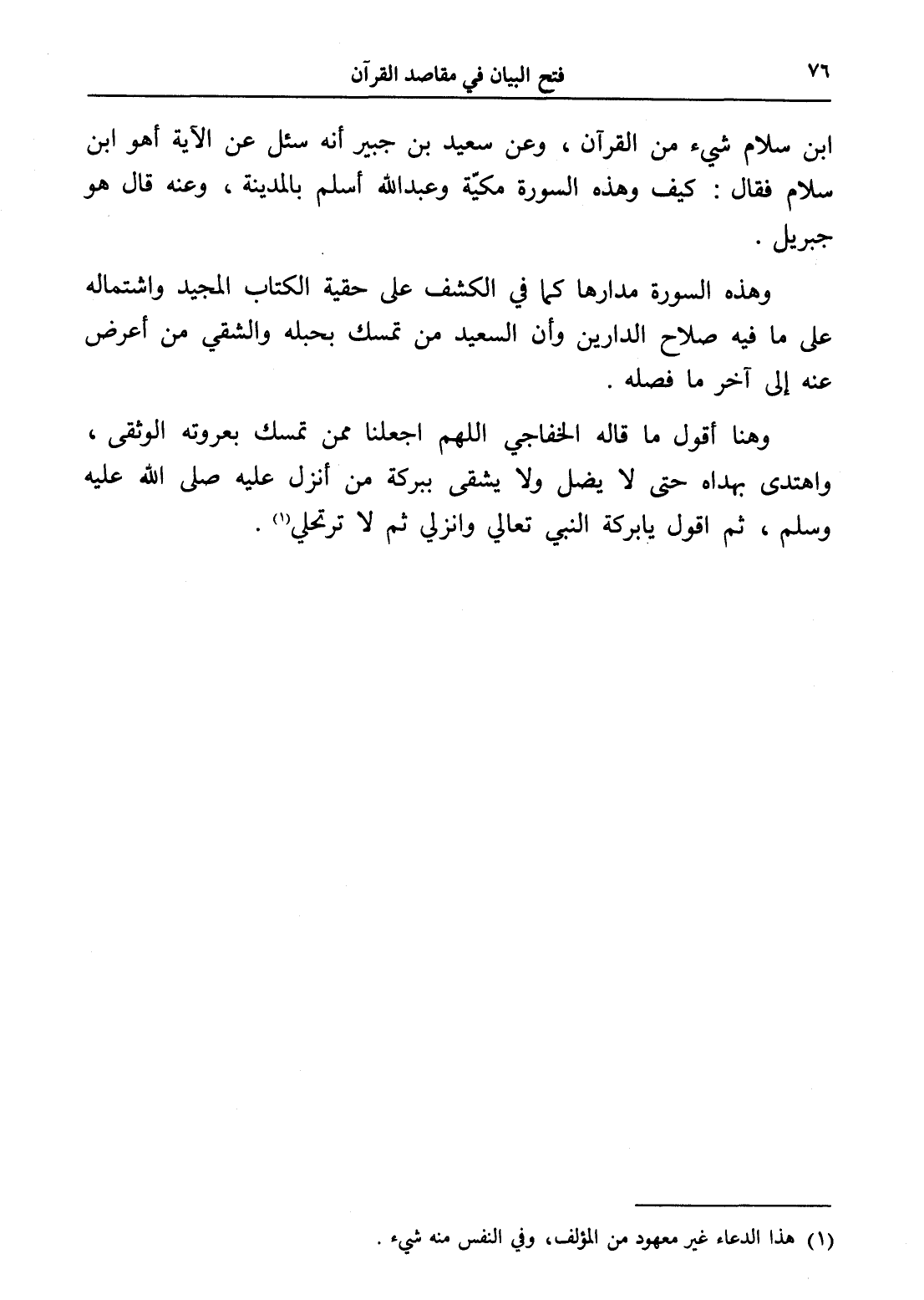 وهنا أقول ما قاله الخفاجي اللهم اجعلنا ممن تمسك بعروته الوثقى، واهتدى بهداه حتى لا يضل ولا يشقى ببركة من أنزل عليه صلى الله عليه وسلم، ثم أقول يا بركة النبي تعالي وانزلي ثم لا ترتحلي (¬1).