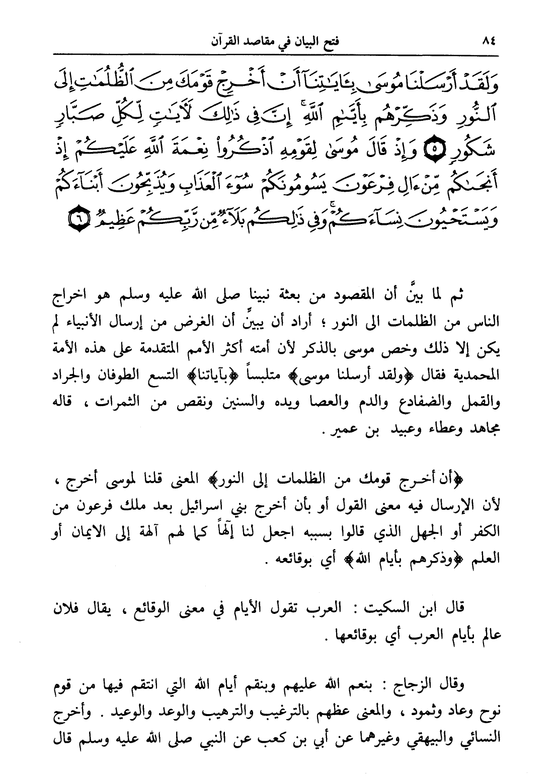 وَلَقَدْ أَرْسَلْنَا مُوسَى بِآيَاتِنَا أَنْ أَخْرِجْ قَوْمَكَ مِنَ الظُّلُمَاتِ إِلَى النُّورِ وَذَكِّرْهُمْ بِأَيَّامِ اللَّهِ إِنَّ فِي ذَلِكَ لَآيَاتٍ لِكُلِّ صَبَّارٍ شَكُورٍ (5) وَإِذْ قَالَ مُوسَى لِقَوْمِهِ اذْكُرُوا نِعْمَةَ اللَّهِ عَلَيْكُمْ إِذْ أَنْجَاكُمْ مِنْ آلِ فِرْعَوْنَ يَسُومُونَكُمْ سُوءَ الْعَذَابِ وَيُذَبِّحُونَ أَبْنَاءَكُمْ وَيَسْتَحْيُونَ نِسَاءَكُمْ وَفِي ذَلِكُمْ بَلَاءٌ مِنْ رَبِّكُمْ عَظِيمٌ (6)