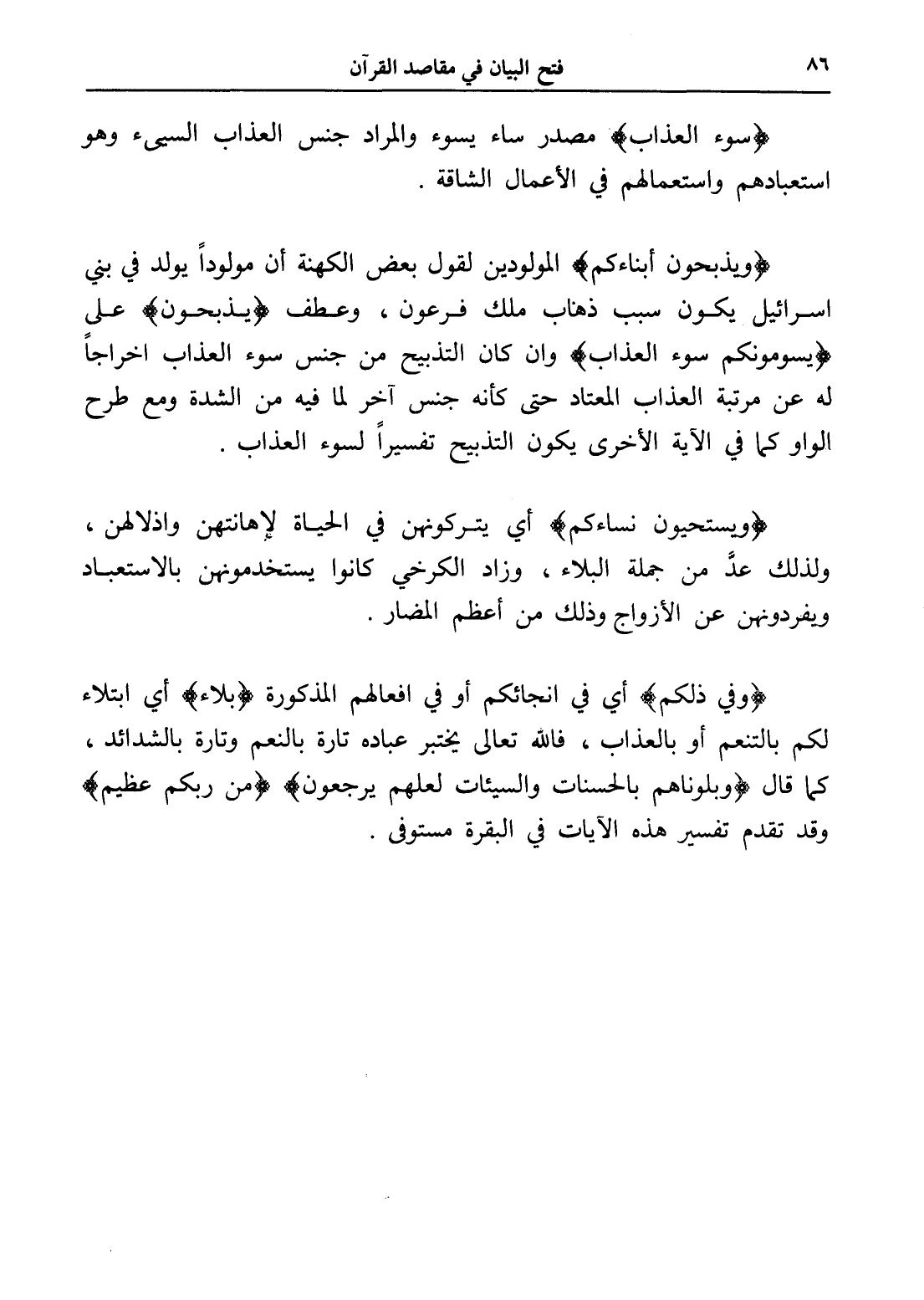 (ويذبحون أبناءكم) المولودين لقول بعض الكهنة أن مولوداً يولد في بني إسرائيل يكون سبب ذهاب ملك فرعون، وعطف (يذبحون) على (يسومونكم سوء العذاب) وإن كان التذبيح من جنس سوء العذاب إخراجاً له عن مرتبة العذاب المعتاد حتى كأنه جنس آخر لما فيه من الشدة ومع طرح الواو كما في الآية الأخرى يكون التذبيح تفسيراً لسوء العذاب.