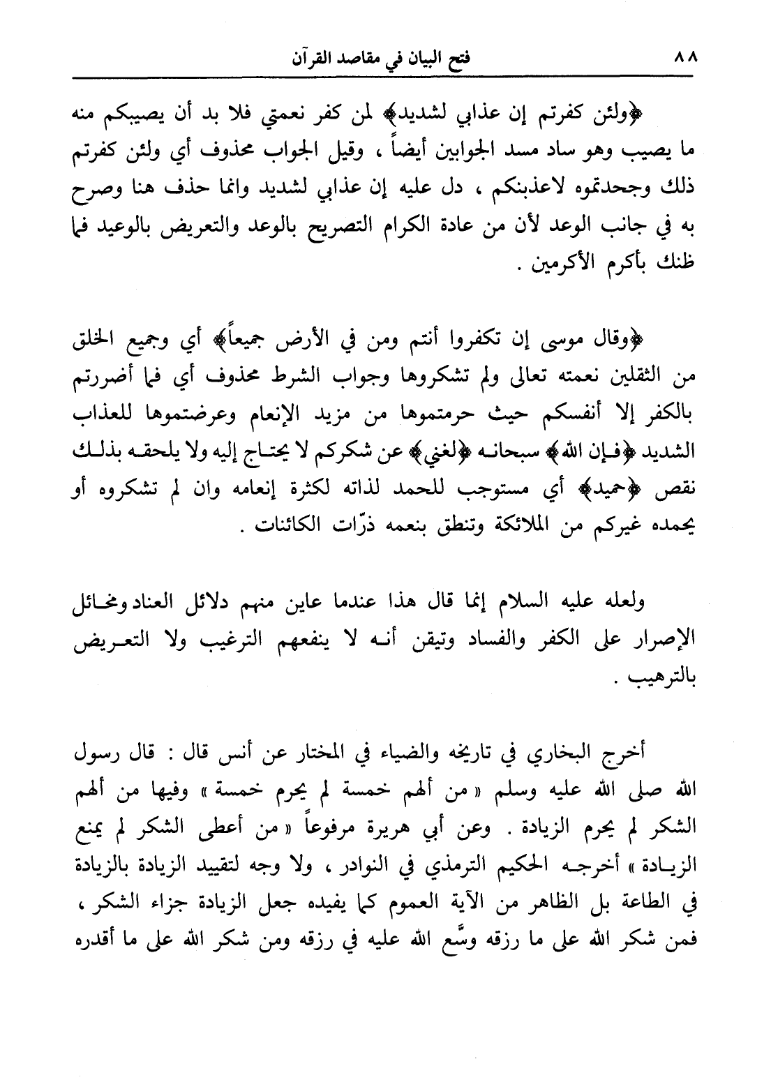 أخرج البخاري في تاريخه والضياء في المختار عن أنس قال: قال رسول الله صلى الله عليه وسلم " من ألهم خمسة لم يحرم خمسة " وفيها من ألهم الشكر لم يحرم الزيادة. وعن أبي هريرة مرفوعاً " من أعطى الشكر لم يمنع الزيادة " أخرجه الحكيم الترمذي في النوادر، ولا وجه لتقييد الزيادة بالزيادة في الطاعة بل الظاهر من الآية العموم كما يفيده جعل الزيادة جزاء الشكر، فمن شكر الله على ما رزقه وسَّع الله عليه في رزقه ومن شكر الله على ما أقدره