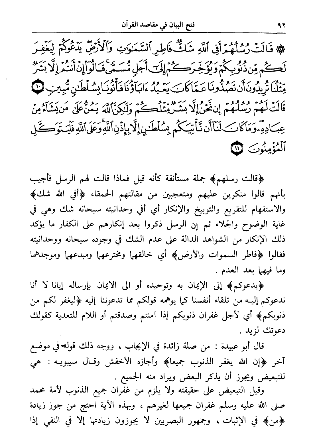 قَالَتْ رُسُلُهُمْ أَفِي اللَّهِ شَكٌّ فَاطِرِ السَّمَاوَاتِ وَالْأَرْضِ يَدْعُوكُمْ لِيَغْفِرَ لَكُمْ مِنْ ذُنُوبِكُمْ وَيُؤَخِّرَكُمْ إِلَى أَجَلٍ مُسَمًّى قَالُوا إِنْ أَنْتُمْ إِلَّا بَشَرٌ مِثْلُنَا تُرِيدُونَ أَنْ تَصُدُّونَا عَمَّا كَانَ يَعْبُدُ آبَاؤُنَا فَأْتُونَا بِسُلْطَانٍ مُبِينٍ (10) قَالَتْ لَهُمْ رُسُلُهُمْ إِنْ نَحْنُ إِلَّا بَشَرٌ مِثْلُكُمْ وَلَكِنَّ اللَّهَ يَمُنُّ عَلَى مَنْ يَشَاءُ مِنْ عِبَادِهِ وَمَا كَانَ لَنَا أَنْ نَأْتِيَكُمْ بِسُلْطَانٍ إِلَّا بِإِذْنِ اللَّهِ وَعَلَى اللَّهِ فَلْيَتَوَكَّلِ الْمُؤْمِنُونَ (11)