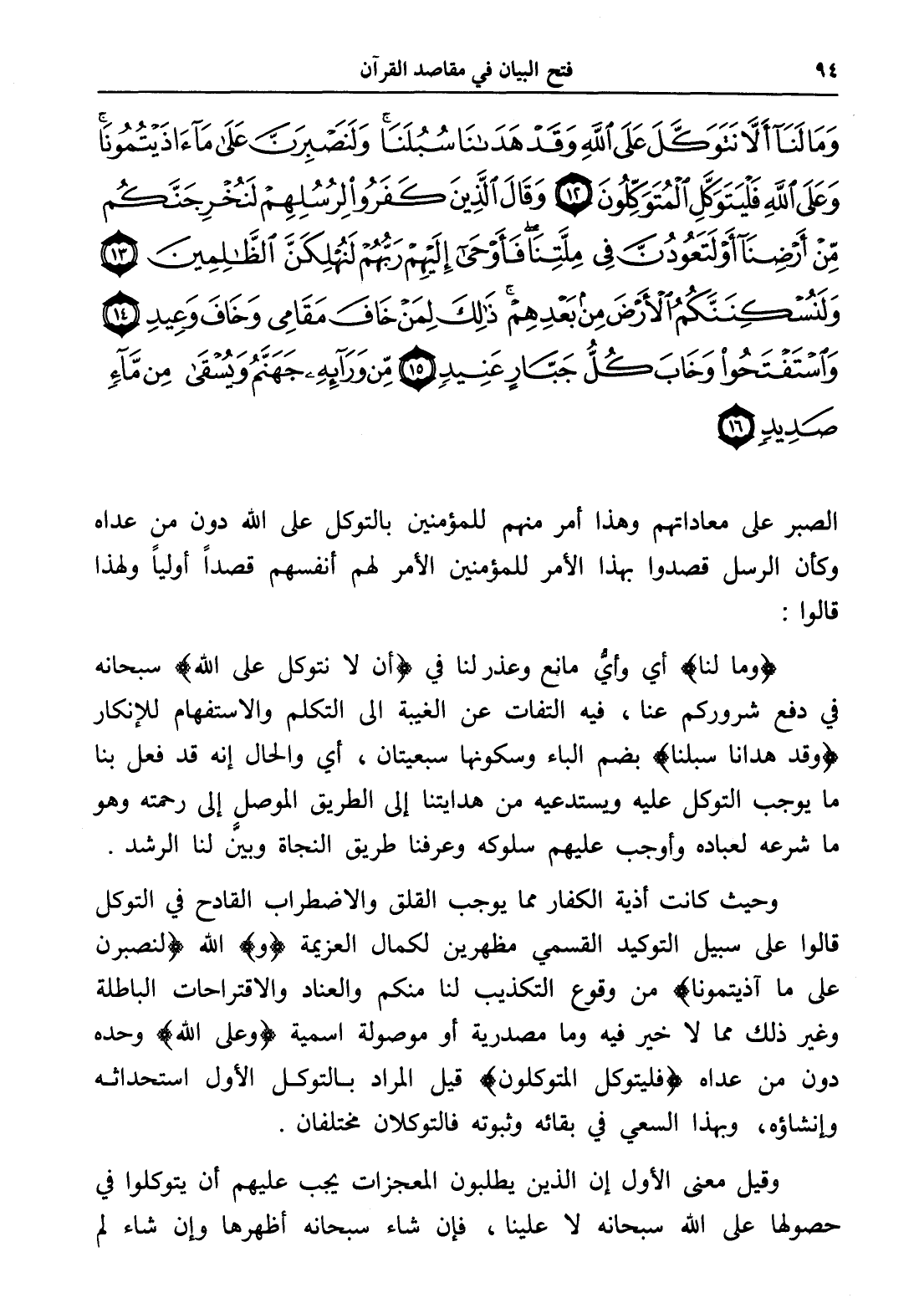 وَمَا لَنَا أَلَّا نَتَوَكَّلَ عَلَى اللَّهِ وَقَدْ هَدَانَا سُبُلَنَا وَلَنَصْبِرَنَّ عَلَى مَا آذَيْتُمُونَا وَعَلَى اللَّهِ فَلْيَتَوَكَّلِ الْمُتَوَكِّلُونَ (12) وَقَالَ الَّذِينَ كَفَرُوا لِرُسُلِهِمْ لَنُخْرِجَنَّكُمْ مِنْ أَرْضِنَا أَوْ لَتَعُودُنَّ فِي مِلَّتِنَا فَأَوْحَى إِلَيْهِمْ رَبُّهُمْ لَنُهْلِكَنَّ الظَّالِمِينَ (13) وَلَنُسْكِنَنَّكُمُ الْأَرْضَ مِنْ بَعْدِهِمْ ذَلِكَ لِمَنْ خَافَ مَقَامِي وَخَافَ وَعِيدِ (14) وَاسْتَفْتَحُوا وَخَابَ كُلُّ جَبَّارٍ عَنِيدٍ (15) مِنْ وَرَائِهِ جَهَنَّمُ وَيُسْقَى مِنْ مَاءٍ صَدِيدٍ (16)