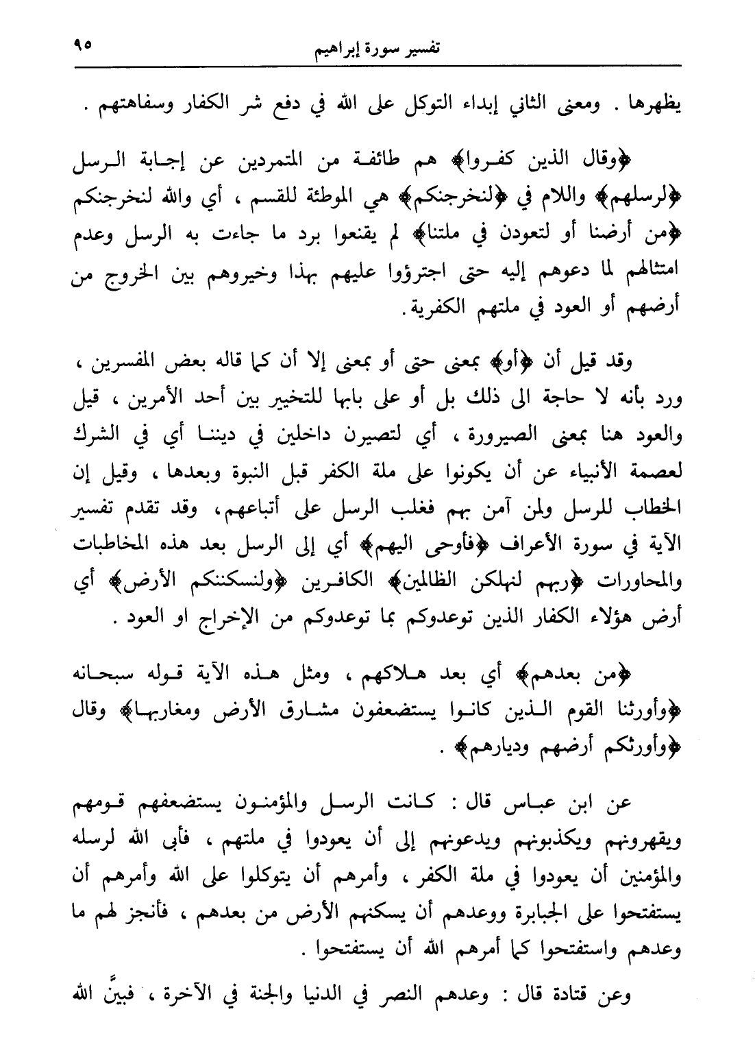 عن ابن عباس قال: كانت الرسل والمؤمنون يستضعفهم قومهم ويقهرونهم ويكذبونهم ويدعونهم إلى أن يعودوا في ملتهم، فأبى الله لرسله والمؤمنين أن يعودوا في ملة الكفر، وأمرهم أن يتوكلوا على الله وأمرهم أن يستفتحوا على الجبابرة ووعدهم أن يسكنهم الأرض من بعدهم، فأنجز لهم ما وعدهم واستفتحوا كما أمرهم الله أن يستفتحوا.