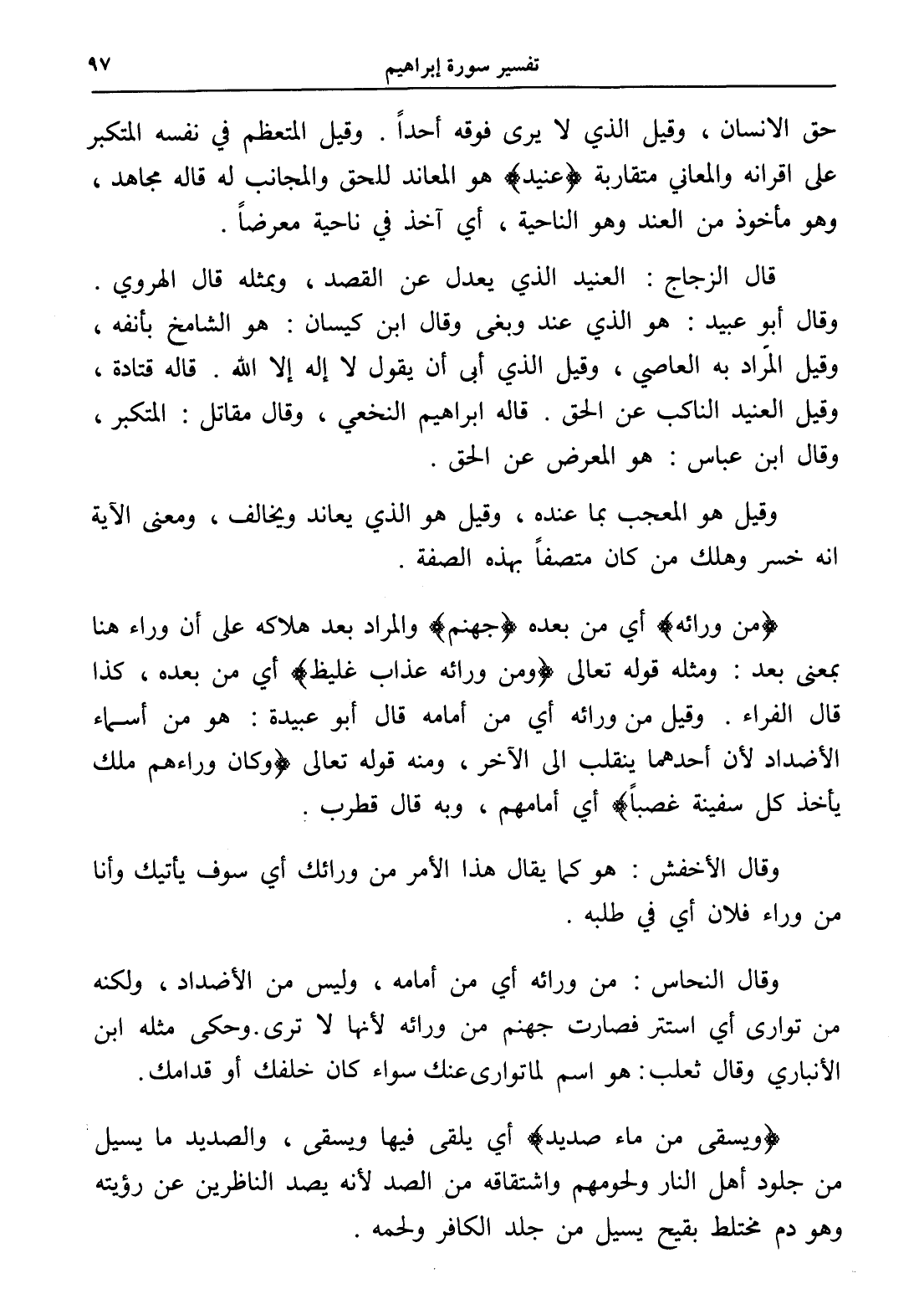حق الإنسان، وقيل الذي لا يرى فوقه أحداً. وقيل المتعظم في نفسه المتكبر على أقرانه والمعاني متقاربة (عنيد) هو المعاند للحق والمجانب له قاله مجاهد، وهو مأخوذ من العقد وهو الناحية، أي آخذ في ناحية معرضاً.