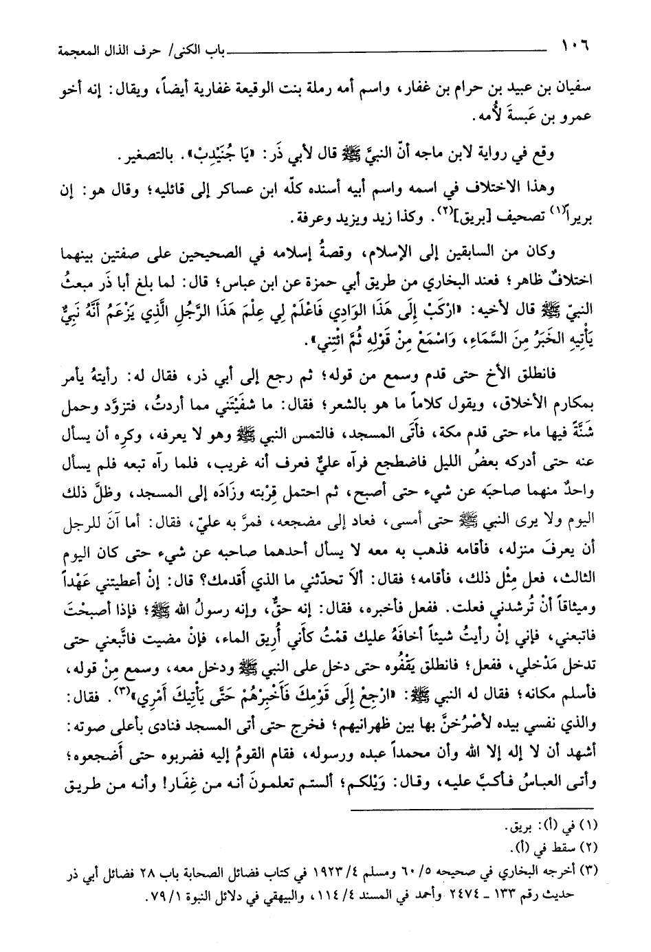 (٣) أخرجه البخاري في صحيحه ٥/ ٦٠ ومسلم ٤/ ١٩٢٣ في كتاب فضائل الصحابة باب ٢٨ فضائل أبي ذر حديث رقم ١٣٣- ٢٤٧٤ وأحمد في المسند ٤/ ١١٤، والبيهقي في دلائل النبوة ١/ ٧٩.