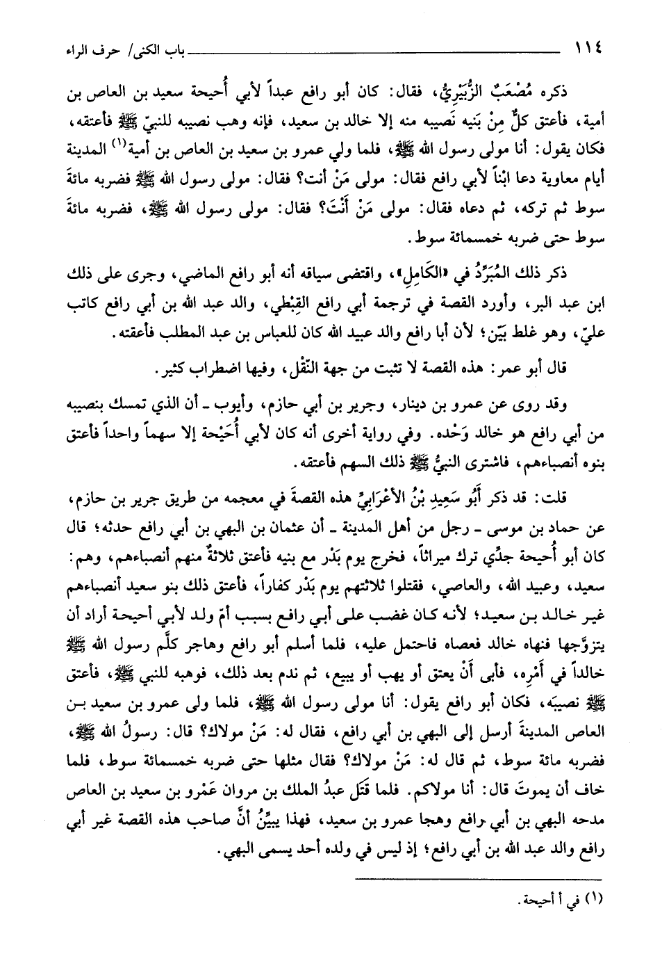 سعيد، وعبيد اللَّه، والعاصي، فقتلوا ثلاثتهم يوم بدر كفارا، فأعتق ذلك بنو سعيد أنصباءهم غير خالد بن سعيد، لأنه كان غضب على أبي رافع بسبب أمّ ولد لأبي أحيحة أراد أن يتزوّجها فنهاه خالد فعصاه فاحتمل عليه، فلما أسلم أبو رافع وهاجر كلّم رسول اللَّه صلى اللَّه عليه وسلّم خالدا في أمره، فأبى أن يعتق أو يهب أو يبيع، ثم ندم بعد ذلك، فوهبه للنّبيّ صلى اللَّه عليه وسلّم، فأعتق صلى اللَّه عليه وسلّم نصيبه، فكان أبو رافع يقول: أنا مولى رسول اللَّه صلى اللَّه عليه وسلّم، فلما ولى عمرو بن سعيد بن العاص المدينة أرسل إلى البهي بن أبي رافع، فقال له: من مولاك؟ قال: رسول اللَّه صلى اللَّه عليه وسلّم، فضربه مائة سوط، ثم قال له: من مولاك؟ فقال مثلها حتى ضربه خمسمائة سوط، فلما خاف أن يموت قال: أنا مولاكم. فلما قتل عبد الملك بن مروان عمرو بن سعيد بن العاص مدحه البهي بن أبي رافع وهجا عمرو بن سعيد، فهذا يبيّن أنّ صاحب هذه القصة غير أبي رافع والد عبد اللَّه بن أبي رافع، إذ ليس في ولده أحد يسمى البهي.