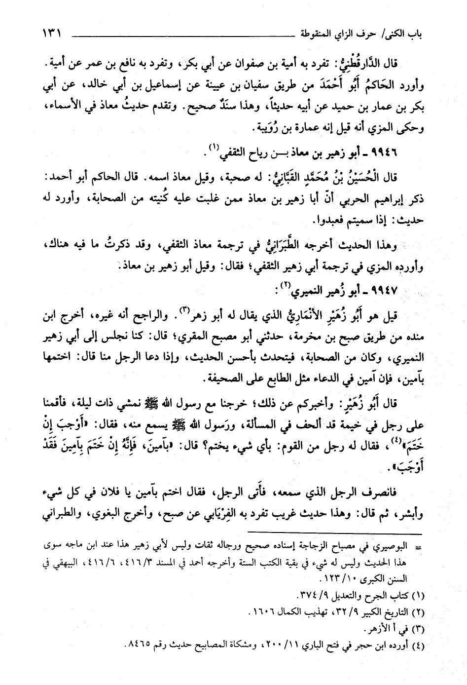 قال أبو زهير: وأخبركم عن ذلك، خرجنا مع رسول اللَّه صلى اللَّه عليه وسلّم نمشي ذات ليلة، فأقمنا على رجل في خيمة قد ألحف في المسألة، ورسول اللَّه صلى اللَّه عليه وسلّم يسمع منه، فقال: «أوجب إن ختم» «٤» ، فقال له رجل من القوم: بأي شيء يختم؟ قال: «بآمين، فإنّه إن ختم بآمين فقد أوجب» .