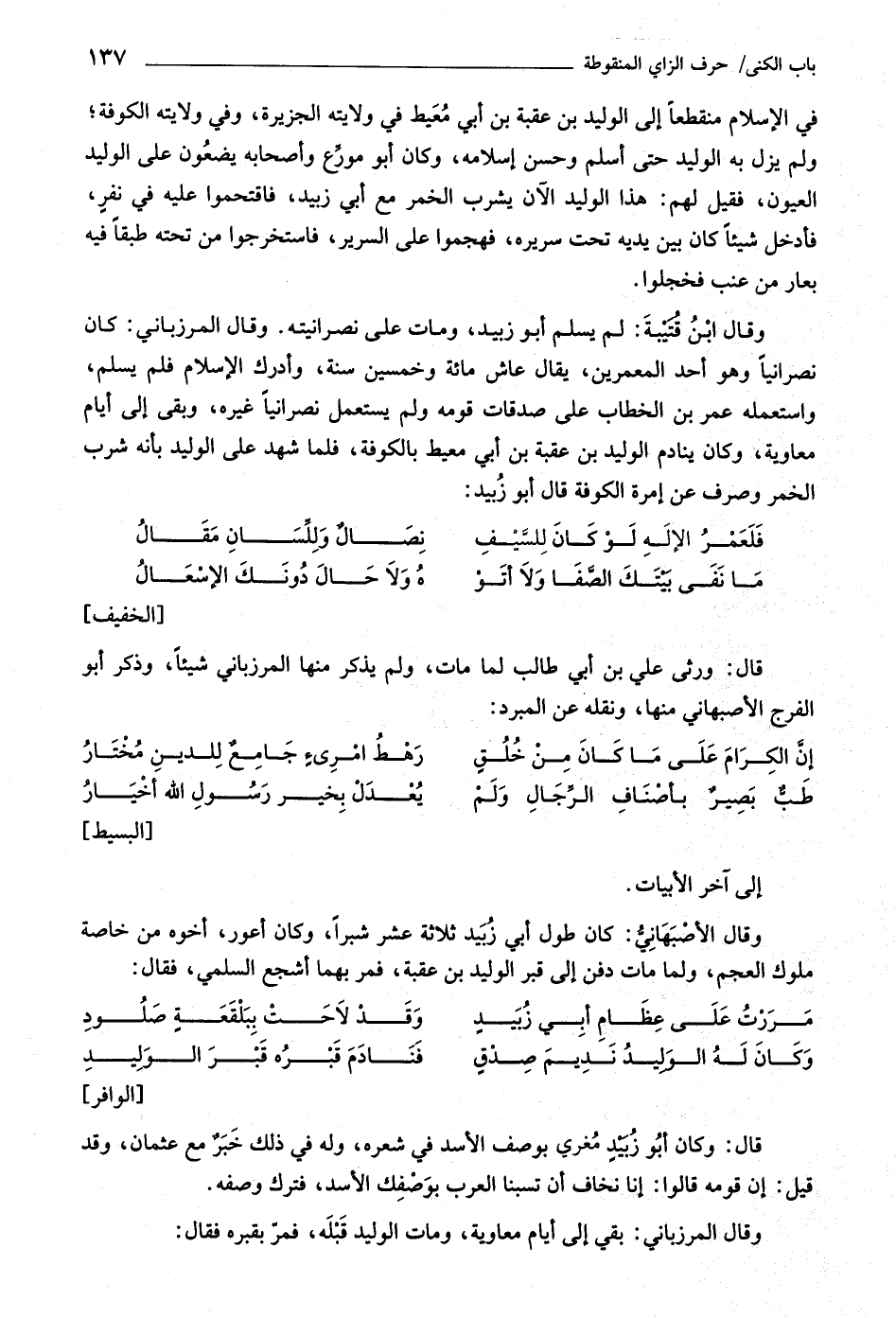 [الوافر] قال: وكان أبو زبيد مغري بوصف الأسد في شعره، وله في ذلك خبر مع عثمان، وقد قيل: إن قومه قالوا: إنا نخاف أن تسبنا العرب بوصفك الأسد، فترك وصفه.