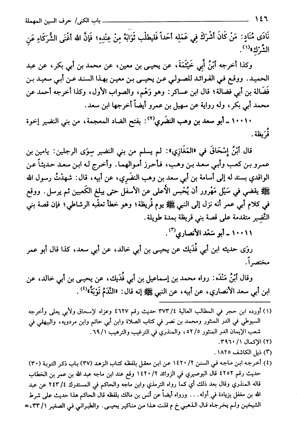 وقال ابن مندة: رواه محمد بن إسماعيل بن أبي فديك، عن يحيى بن أبي خالد، عن ابن أبي سعد الأنصاري، عن أبيه، عن النبي صلى اللَّه عليه وسلّم إنه قال: «النّدم توبة» «٤» .