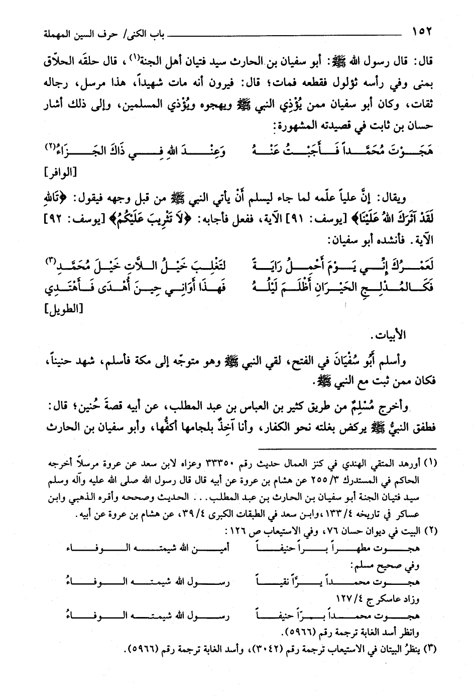 (١) أورده المتقي الهندي في كنز العمال حديث رقم ٣٣٣٥٠ وعزاه لابن سعد عن عروة مرسلا أخرجه الحاكم في المستدرك ٣/ ٢٥٥ عن هشام بن عروة عن أبيه قال قال رسول اللَّه صلى اللَّه عليه وآله وسلّم سيد فتيان الجنة أبو سفيان بن الحارث بن عبد المطلب ... الحديث وصححه وأقره الذهبي وابن عساكر في تاريخه ٤/ ١٣٣، وابن سعد في الطبقات الكبرى ٤/ ٣٩، عن هشام بن عروة عن أبيه.