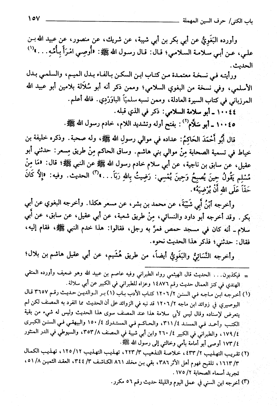 (٢) تقريب التهذيب ٢/ ٤٣٣، خلاصة التذهيب ٣/ ٢٢٣، تهذيب التهذيب ١٢/ ١٢٥، تهذيب الكمال ٣/ ١٦١٣، تلقيح فهوم أهل الأثر ٣٨٦، بقي بن مخلد ٨٦١ الكاشف ٣/ ٣٤٤، العقد الثمين ٨/ ٥١، تجريد أسماء الصحابة ٢/ ١٧٥.
