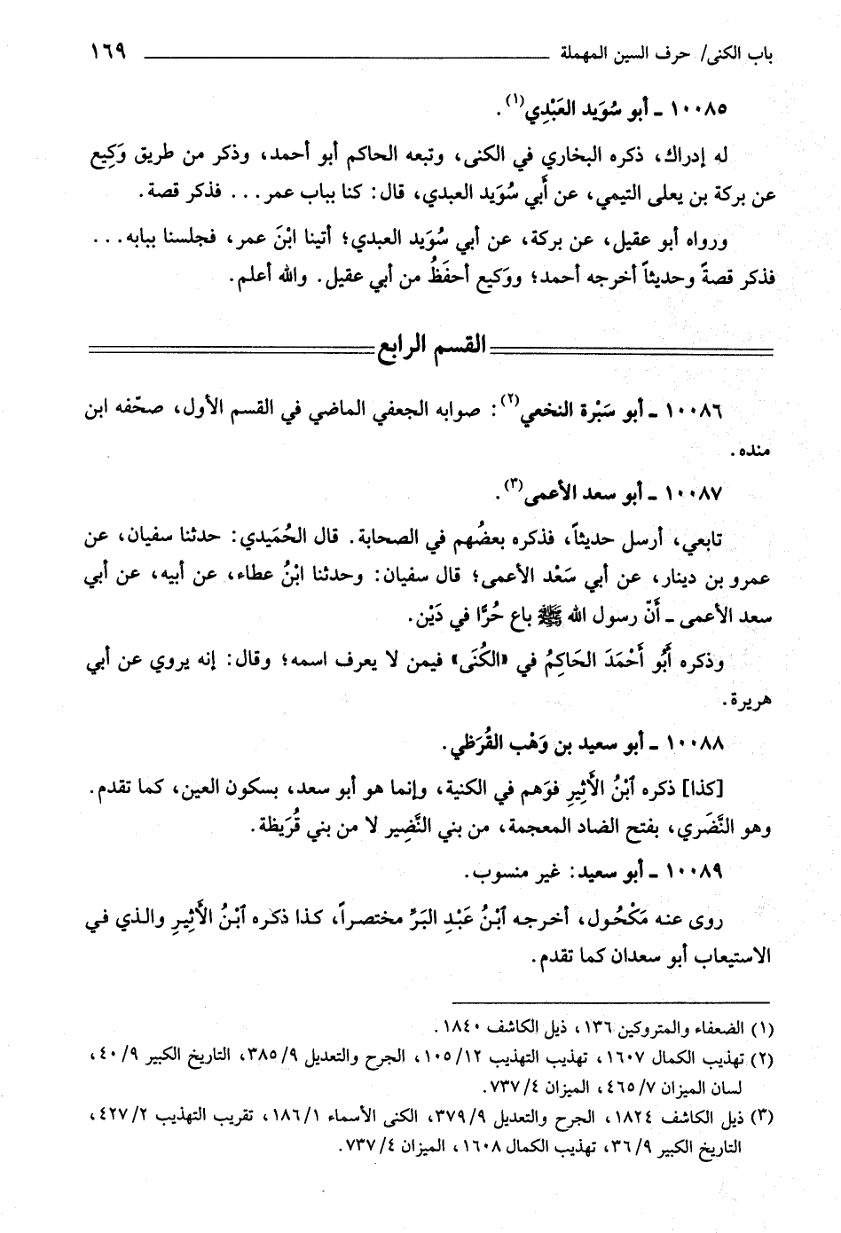 (٣) ذيل الكاشف ١٨٢٤، الجرح والتعديل ٩/ ٣٧٩، الكنى الأسماء ١/ ١٨٦، تقريب التهذيب ٢/ ٤٢٧، التاريخ الكبير ٩/ ٣٦، تهذيب الكمال ١٦٠٨، الميزان ٤/ ٧٣٧.