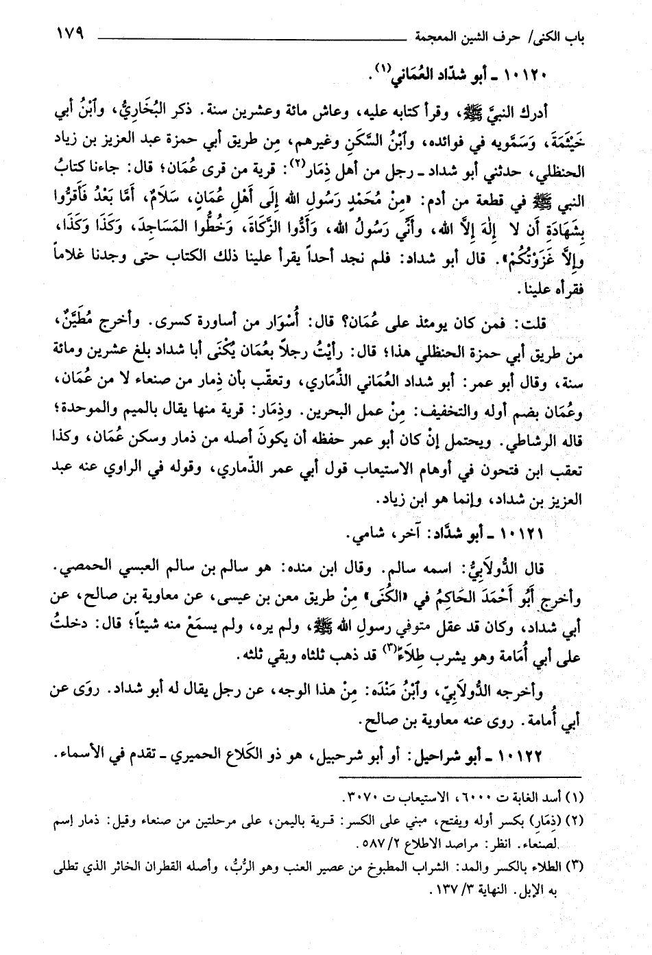 قلت: فمن كان يومئذ على عمان؟ قال: أسوار من أساورة كسرى. وأخرج مطيّن، من طريق أبي حمزة الحنظليّ هذا، قال: رأيت رجلا بعمان يكنى أبا شداد بلغ عشرين ومائة سنة، وقال أبو عمر: أبو شداد العماني الذّماريّ، وتعقّب بأن ذمار من صنعاء لا من عمان، وعمان بضم أوله والتخفيف: من عمل البحرين. وذمار: قرية منها يقال بالميم والموحدة، قاله الرشاطي. ويحتمل إن كان أبو عمر حفظه أن يكون أصله من ذمار وسكن عمان، وكذا تعقب ابن فتحون في أوهام الاستيعاب قول أبي عمر الذّماريّ، وقوله في الراويّ عنه عبد العزيز بن شداد، وإنما هو ابن زياد.
