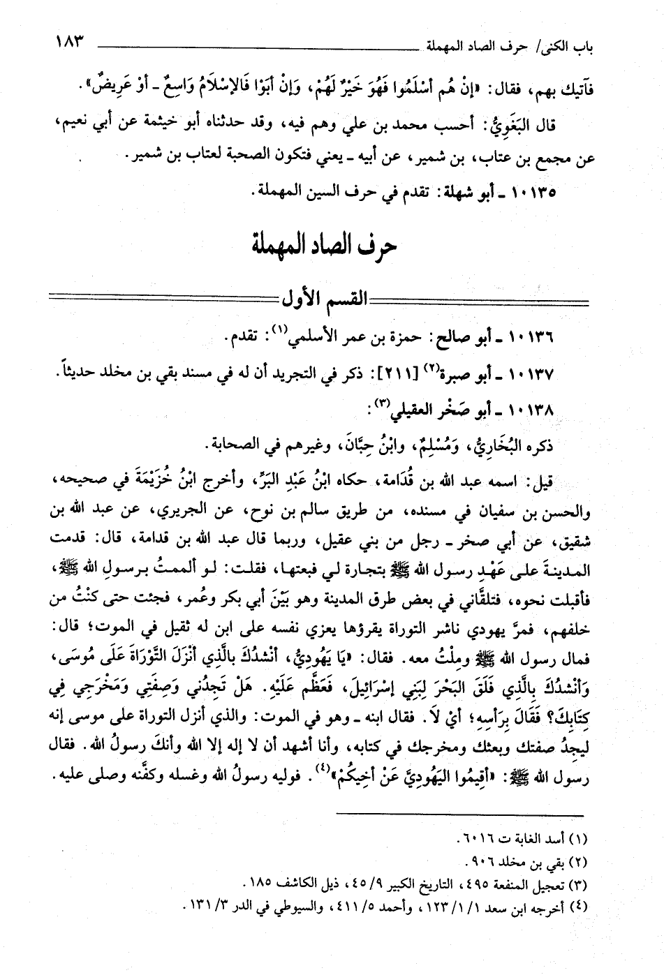 حكاه ابن عبد البرّ، وأخرج ابن خزيمة في صحيحه، والحسن بن سفيان في مسندة، من طريق سالم بن نوح، عن الجريريّ، عن عبد اللَّه بن شقيق، عن أبي صخر- رجل من بني عقيل، وربما قال عبد اللَّه بن قدامة، قال: قدمت المدينة على عهد رسول اللَّه صلى اللَّه عليه وسلّم بتجارة لي فبعتها، فقلت: لو ألممت برسول اللَّه صلى اللَّه عليه وسلّم، فأقبلت نحوه، فتلقّاني في بعض طرق المدينة وهو بين أبي بكر وعمر، فجئت حتى كنت من خلفهم، فمرّ يهودي ناشر التوراة يقرؤها يعزي نفسه على ابن له ثقيل في الموت، قال: