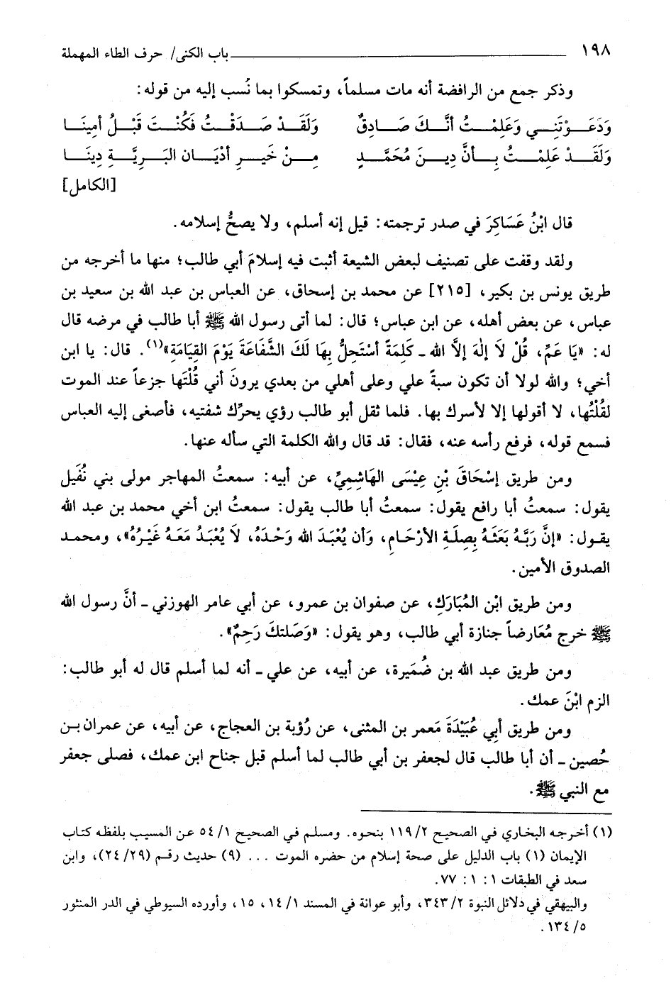 ومن طريق أبي عبيدة معمر بن المثنى، عن رؤية بن العجاج، عن أبيه، عن عمران بن حصين- أن أبا طالب قال لجعفر بن أبي طالب لما أسلم قبل جناح ابن عمك، فصلى جعفر مع النبي صلى اللَّه عليه وسلّم.