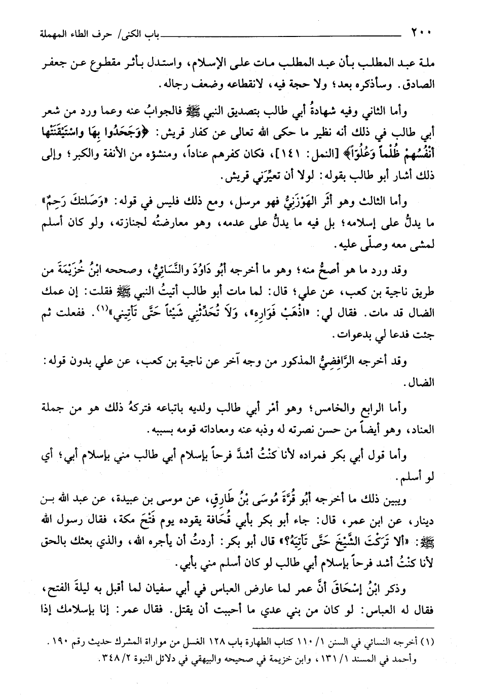 وأما الثاني وفيه شهادة أبي طالب بتصديق النبي صلى اللَّه عليه وسلّم فالجواب عنه وعما ورد من شعر أبي طالب في ذلك أنه نظير ما حكى اللَّه تعالى عن كفار قريش: وَجَحَدُوا بِها وَاسْتَيْقَنَتْها أَنْفُسُهُمْ ظُلْماً وَعُلُوًّا [النمل: ١٤] ، فكان كفرهم عنادا، ومنشؤه من الأنفة والكبر، وإلى ذلك أشار أبو طالب بقوله: لولا أن تعيّرني قريش.