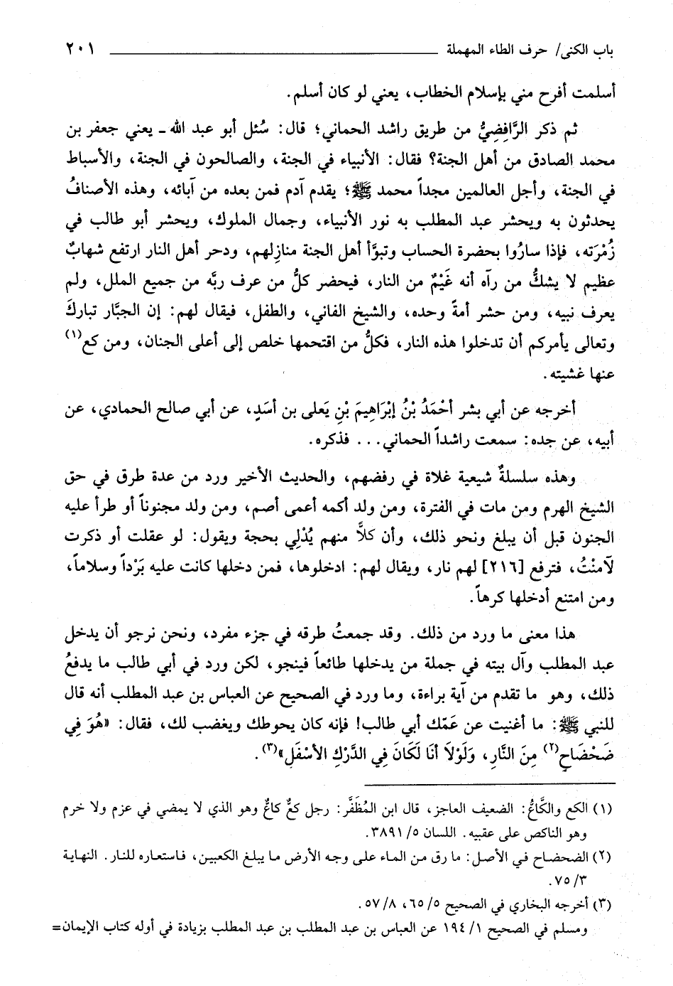 ثم ذكر الرّافضيّ من طريق راشد الحماني، قال: سئل أبو عبد اللَّه- يعني جعفر بن محمّد الصادق من أهل الجنة؟ فقال: الأنبياء في الجنة، والصالحون في الجنة، والأسباط في الجنة، وأجل العالمين مجدا محمّد صلى اللَّه عليه وسلّم، يقدم آدم فمن بعده من آبائه، وهذه الأصناف يحدثون به ويحشر عبد المطلب به نور الأنبياء، وجمال الملوك، ويحشر أبو طالب في زمرته، فإذا ساروا بحضرة الحساب وتبوّأ أهل الجنة منازلهم، ودحر أهل النار ارتفع شهاب عظيم لا يشكّ من رآه أنه غيم من النار، فيحضر كلّ من عرف ربّه من جميع الملل، ولم يعرف نبيه، ومن حشر أمة وحده، والشيخ الفاني، والطفل، فيقال لهم: إن الجبّار تبارك وتعالى يأمركم أن تدخلوا هذه النار، فكلّ من اقتحمها خلص إلى أعلى الجنان، ومن كع «١» عنها غشيته.