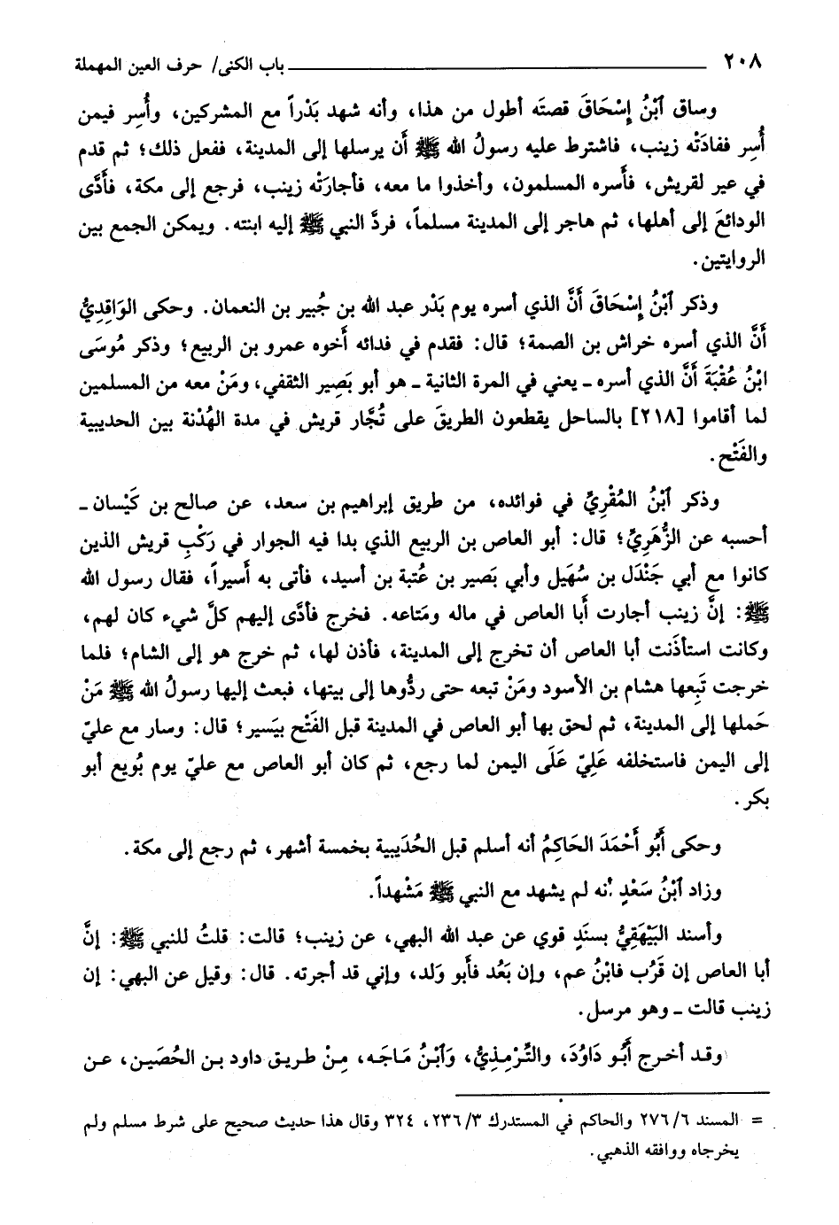 وأسند البيهقيّ بسند قوي عن عبد اللَّه البهي، عن زينب، قالت: قلت للنّبيّ صلى اللَّه عليه وسلّم: إنّ أبا العاص إن قرب فابن عم، وإن بعد فأبو ولد، وإني قد أجرته. قال: وقيل عن البهي: إن زينب قالت- وهو مرسل.