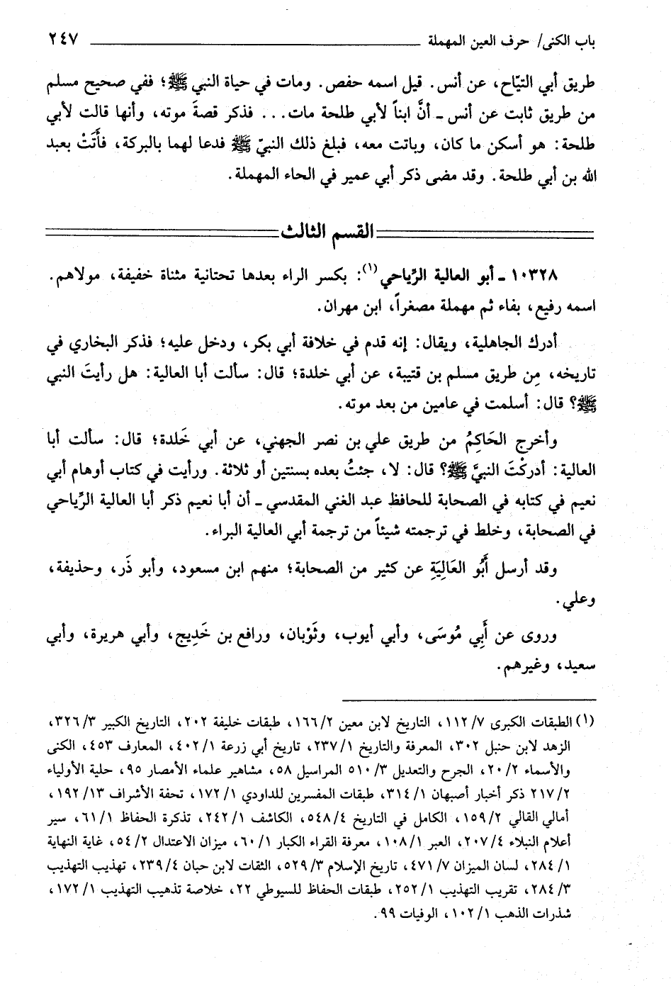 وأخرج الحاكم من طريق علي بن نصر الجهنيّ، عن أبي خلدة، قال: سألت أبا العالية: أدركت النبيّ صلى اللَّه عليه وسلّم؟ قال: لا، جئت بعده بسنتين أو ثلاثة. ورأيت في كتاب أوهام أبي نعيم في كتابه في الصحابة للحافظ عبد الغني المقدسي- أن أبا نعيم ذكر أبا العالية الرّياحي في الصحابة، وخلط في ترجمته شيئا من ترجمة أبي العالية البراء.