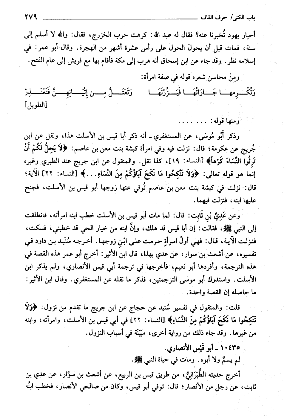 وعن عديّ بن ثابت: قال: لما مات أبو قيس بن الأسلت خطب ابنه امرأته، فانطلقت إلى النبي صلى اللَّه عليه وسلّم، فقالت: إن أبا قيس قد هلك، وإنّ ابنه من خيار الحي قد خطبني، فسكت، فنزلت الآية، قال: فهي أول امرأة حرمت على ابن زوجها. أخرجه سنيد بن داود في تفسيره، عن أشعث بن سوار، عن عدي بهذا، قال ابن الأثير: أخرج أبو عمر هذه القصة في هذه الترجمة، وأفردها أبو نعيم، فأخرجها في ترجمة أبي قيس الأنصاري، ولم يذكر ابن الأسلت. واستدرك أبو موسى الترجمتين، فذكر ما نقله عن المستغفري. وقال ابن الأثير: