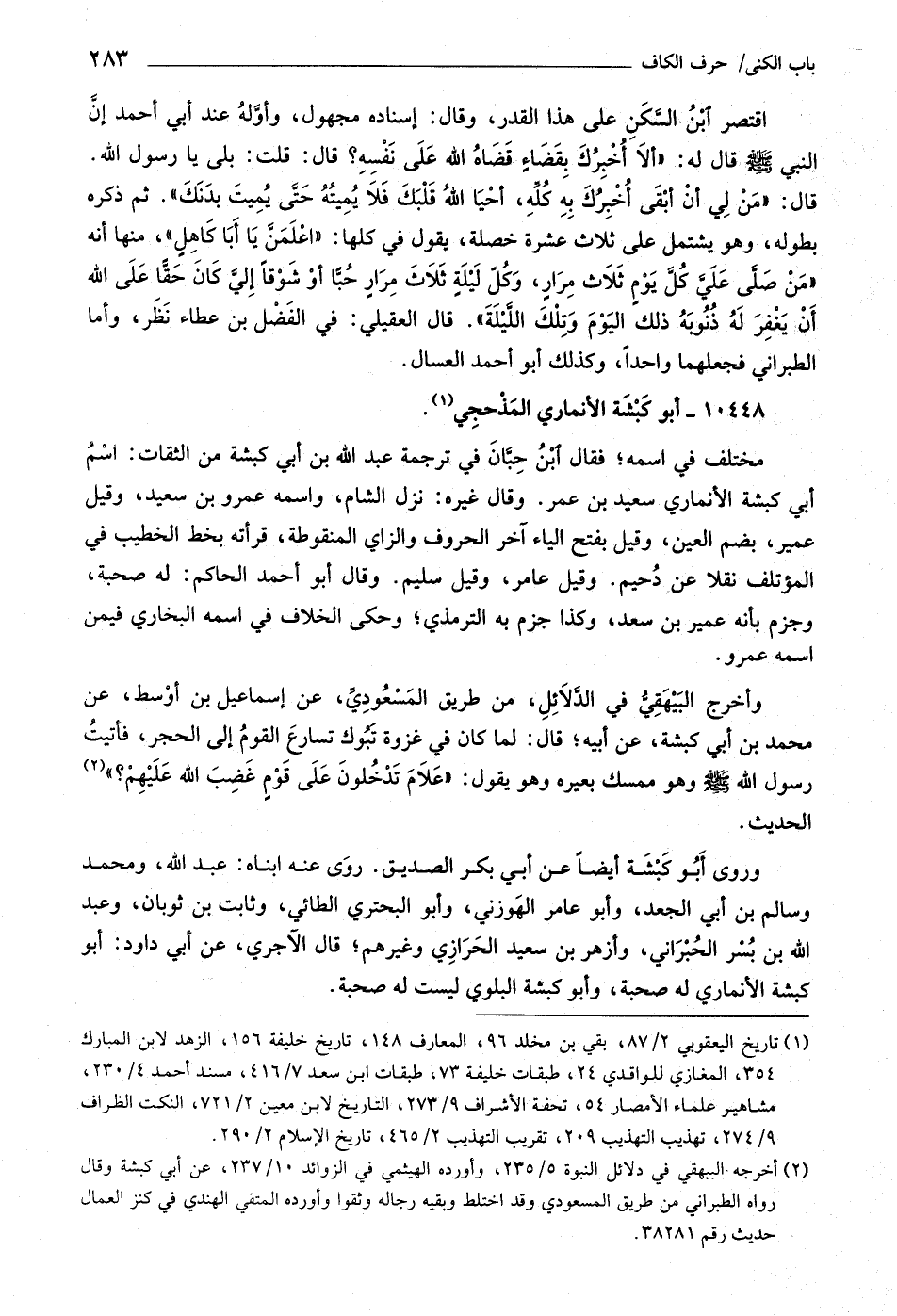 . مختلف في اسمه، فقال ابن حبّان في ترجمة عبد اللَّه بن أبي كبشة من الثقات: اسم أبي كبشة الأنماري سعيد بن عمر. وقال غيره: نزل الشام، واسمه عمرو بن سعيد، وقيل عمير، بضم العين، وقيل بفتح الياء آخر الحروف والزاي المنقوطة، قرأته بخط الخطيب في المؤتلف نقلا عن دحيم. وقيل عامر، وقيل سليم. وقال أبو أحمد الحاكم: له صحبة، وجزم بأنه عمير بن سعد، وكذا جزم به الترمذي، وحكى الخلاف في اسمه البخاري فيمن اسمه عمرو.
