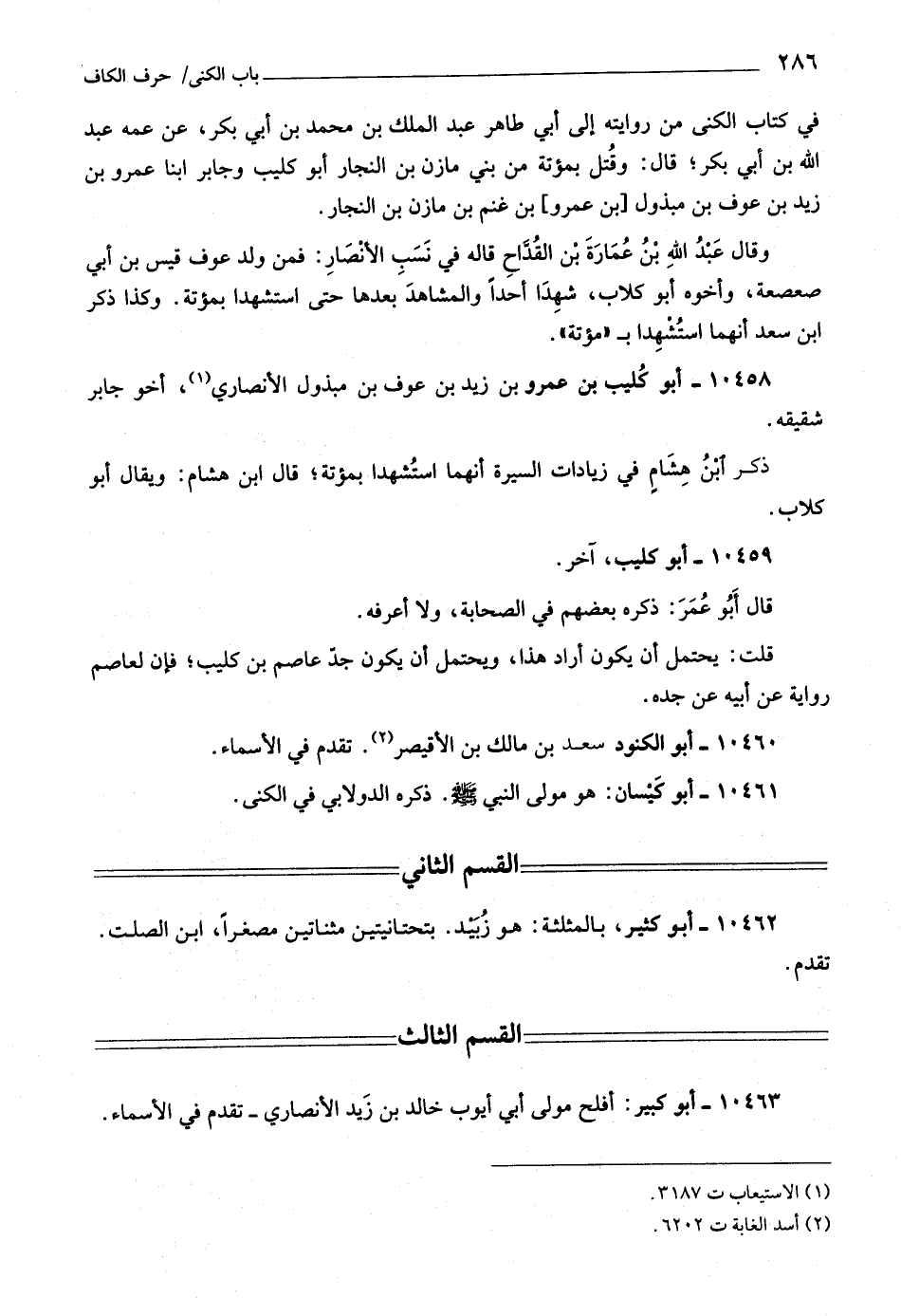في كتاب الكنى من روايته إلى أبي طاهر عبد الملك بن محمد بن أبي بكر، عن عمه عبد اللَّه بن أبي بكر، قال: وقتل بمؤتة من بني مازن بن النجار أبو كليب وجابر ابنا عمرو بن زيد بن عوف بن مبذول [بن عمرو] بن غنم بن مازن بن النجار.
