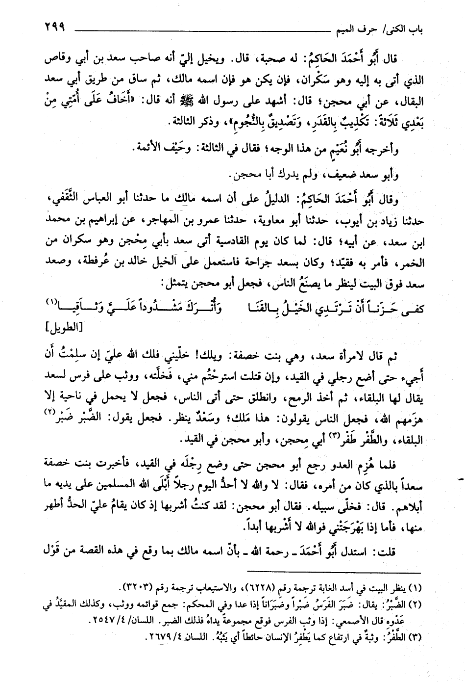 وقال أبو أحمد الحاكم: الدليل على أن اسمه مالك ما حدثنا أبو العباس الثّقفي، حدثنا زياد بن أيوب، حدثنا أبو معاوية، حدثنا عمرو بن المهاجر، عن إبراهيم بن محمد ابن سعد، عن أبيه، قال: لما كان يوم القادسية أتى سعد بأبي محجن وهو سكران من الخمر، فأمر به فقيّد، وكان بسعد جراحة فاستعمل على الخيل خالد بن عرفطة، وصعد سعد فوق البيت لينظر ما يصنع الناس، فجعل أبو محجن يتمثل: