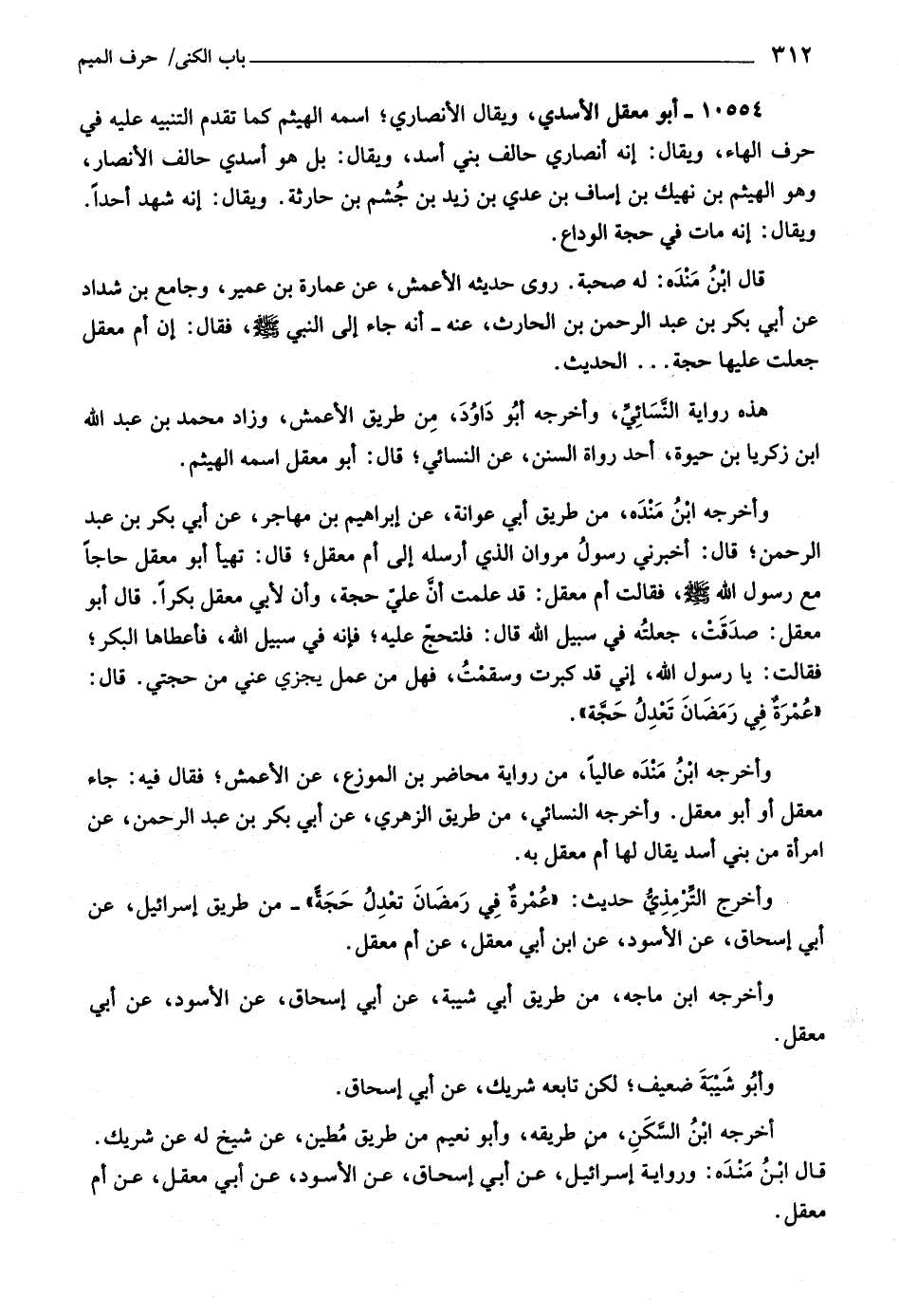 وأخرجه ابن مندة، من طريق أبي عوانة، عن إبراهيم بن مهاجر، عن أبي بكر بن عبد الرحمن، قال: أخبرني رسول مروان الّذي أرسله إلى أم معقل، قال: تهيأ أبو معقل حاجا مع رسول اللَّه صلى اللَّه عليه وسلّم، فقالت أم معقل: قد علمت أنّ عليّ حجة، وأن لأبي معقل بكرا. قال أبو معقل: صدقت، جعلته في سبيل اللَّه قال: فلتحجّ عليه، فإنه في سبيل اللَّه، فأعطاها البكر، فقالت: يا رسول اللَّه، إني قد كبرت وسقمت، فهل من عمل يجزي عني من حجتي. قال: