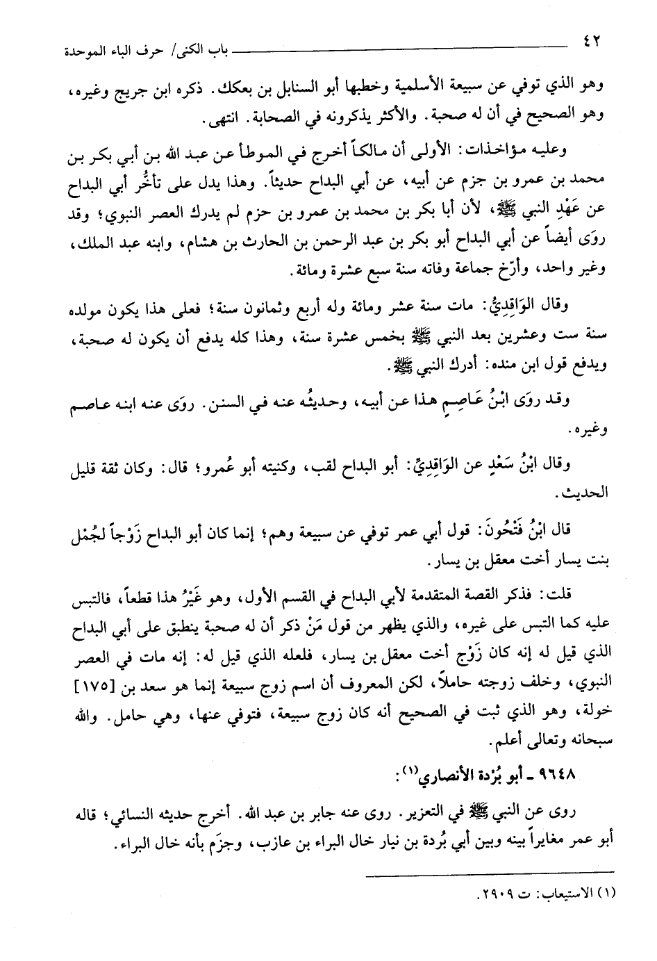قلت: فذكر القصة المتقدمة لأبي البداح في القسم الأول، وهو غير هذا قطعا، فالتبس عليه كما التبس على غيره، والّذي يظهر من قول من ذكر أن له صحبة ينطبق على أبي البداح الّذي قيل له إنه كان زوج أخت معقل بن يسار، فلعله الّذي قيل له: إنه مات في العصر النبوي، وخلف زوجته حاملا، لكن المعروف أن اسم زوج سبيعة إنما هو سعد بن [١٧٥] خولة، وهو الّذي ثبت في الصحيح أنه كان زوج سبيعة، فتوفي عنها، وهي حامل. واللَّه سبحانه وتعالى أعلم.