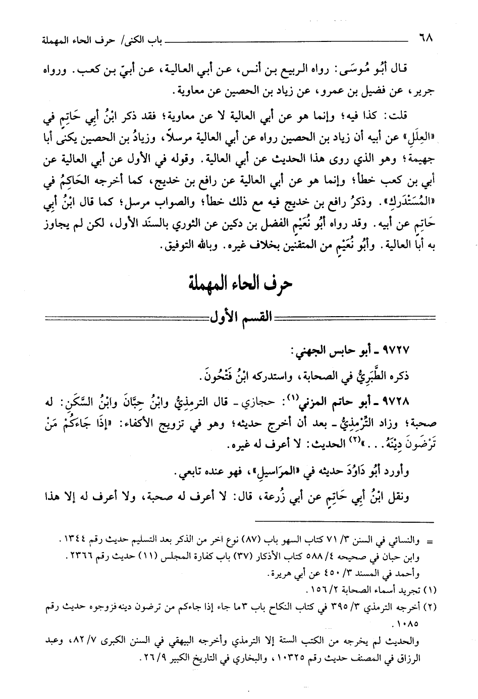 قلت: كذا فيه؛ وإنما هو عن أبي العالية لا عن معاوية؛ فقد ذكر ابن أبي حاتم في «العلل» عن أبيه أن زياد بن الحصين رواه عن أبي العالية مرسلا، وزياد بن الحصين يكنى أبا جهيمة؛ وهو الّذي روى هذا الحديث عن أبي العالية. وقوله في الأول عن أبي العالية عن أبي بن كعب خطأ؛ وإنما هو عن أبي العالية عن رافع بن خديج، كما أخرجه الحاكم في «المستدرك» . وذكر رافع بن خديج فيه مع ذلك خطأ؛ والصواب مرسل؛ كما قال ابن أبي حاتم عن أبيه. وقد رواه أبو نعيم الفضل بن دكين عن الثوري بالسند الأول، لكن لم يجاوز به أبا العالية. وأبو نعيم من المتقنين بخلاف غيره. وباللَّه التوفيق.
